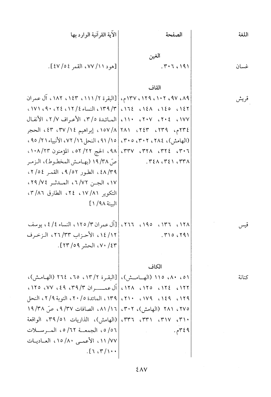 قيس: 128، 136، 195، 266، 291، 315.: [آل عمران 3/ 125، النساء 4/ 4، يوسف 12/ 14، الأحزاب 33/ 26، الزخرف 43/ 70، الحشر 59/ 23] . الكاف