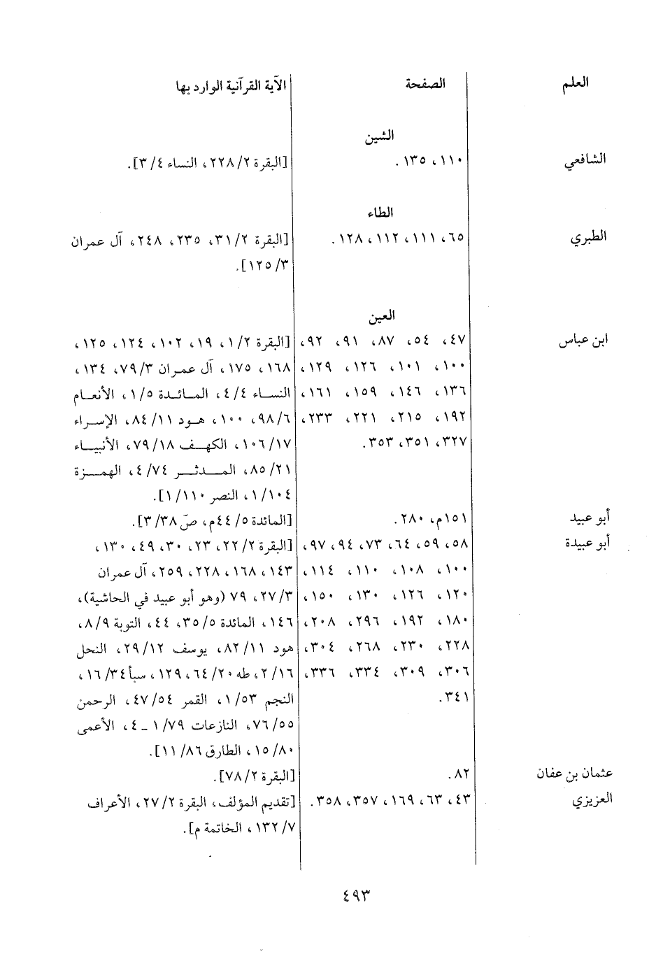 أبو عبيدة: 58، 59، 64، 73، 94، 97، 100، 108، 110، 114، 120، 126، 130، 150، 180، 192، 296، 208، 228، 230، 268، 304، 306، 309، 334، 336، 341.: [البقرة 2/ 22، 23، 30، 49، 130، 143، 168، 228، 259، آل عمران 3/ 27، 79 (وهو أبو عبيد في الحاشية) ، 146، المائدة 5/ 35، 44، التوبة 9/ 8، هود 11/ 82، يوسف 12/ 29، النحل 16/ 2، طه 20/ 64، 129، سبأ 34/ 16، النجم 53/ 1، القمر 54/ 47، الرحمن 55/ 76، النازعات 79/ 1- 4، الأعمى 80/ 15، الطارق 86/ 11] .