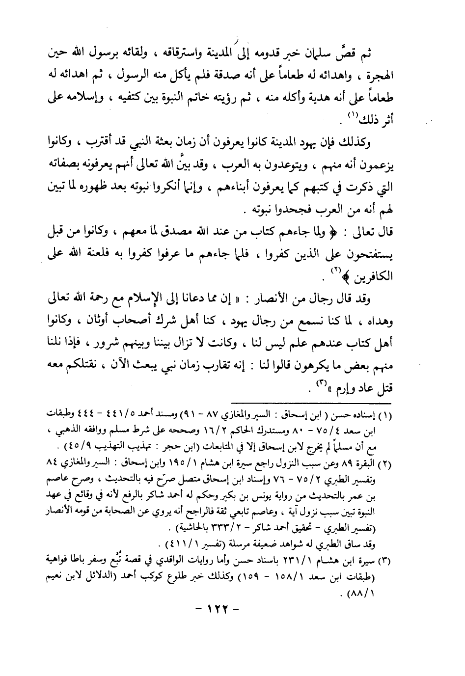 (¬2) البقرة 89 وعن سبب النزول راجع سيرة ابن هشام 1/ 195 وابن إسحاق: السير والمغازي 84 وتفسير الطبري 2/ 75 - 76 وإسناد ابن إسحاق متصل صرح فيه بالتحديث، وصرح عاصم بن عمر بالتحديث من رواية يونس بن بكير وحكم له أحمد شاكر بالرفع لأنه في وقائع في عهد النبوة تبين سبب نزول آية، وعاصم تابعي ثقة فالراجح أنه يروي عن الصحابة من قومه الأنصار