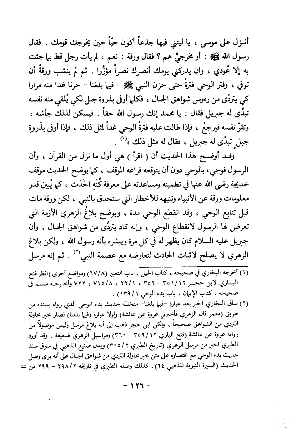 (¬2) ساق البخاري الخبر بعد عبارة - فيما بلغنا - متخللة حديث بدء الوحي الذي رواه بسنده من طريق (معمر قال الزهري فأخبرني عروة عن عائشة) ولولا عبارة (فيما بلغنا) لصار خبر محاولة التردي من الشواهق صحيحاً، ولكن ابن حجر ذهب إلى أنه بلاغ مرسل وليس موصولاً من رواية عروة عن عائشة (فتح الباري 12/ 359 - 360) ومراسيل الزهري ضعيفة. وقد أورد الطبري الخبر من مرسل الزهري (تاريخ الطبري 2/ 305) ويدل صنيع الذهبي في سوق سند حديث بدء الوحي مع اقتصاره على متن خبر محاولة التردي من شواهق الجبال على أنه يرى وصل الحديث (السيرة النبوية للذهبي 64). كذلك وصله الطبري في تاريخه 2/ 298 - 299 من =