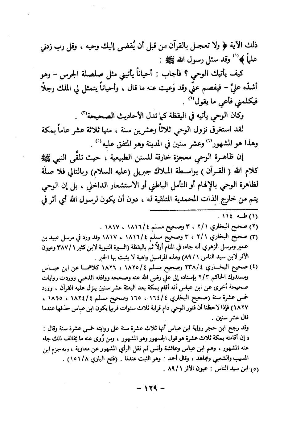(¬4) صحيح البخاري 4/ 238 وصحيح مسلم 4/ 1825، 1826 كلاهما عن ابن عباس ومستدرك الحاكم 3/ 2 بإسناده إلى علي رضي الله عنه وصححه ووافقه الذهبي ووردت روايات صحيحة أخرى عن ابن عباس أنه أقام بمكة بعد البعثة عشر سنين ينزل عليه القرآن، وورد خمس عشرة سنة (صحيح البخاري 4/ 164، 165 وصحيح مسلم 4/ 1824، 1825، 1827) فإذا لاحظنا أن فتور الوحي دام قرابة ثلاث سنوات فربما يكون ابن عباس حذفها عندما قال عشر سنين.