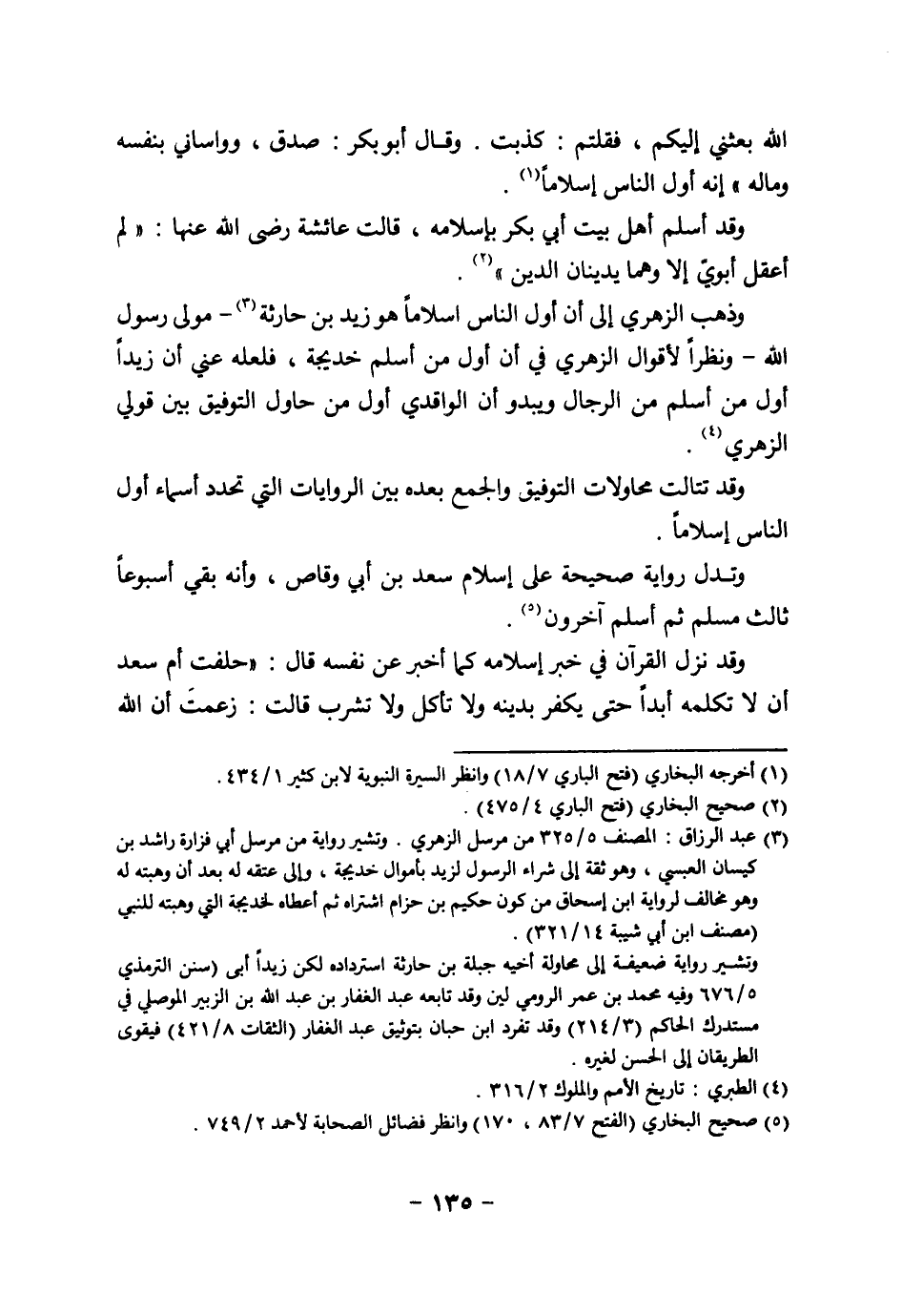 وذهب الزهري إلى أن أول الناس إسلاماً هو زيد بن حارثة (¬3) - مولى رسول الله - ونظراً لأقوال الزهري في أن أول من أسلم خديجة، فلعله عني أن زيداً أول من أسلم من الرجال ويبدو أن الواقدي أول من حاول التوفيق بين قولي الزهري (¬4).