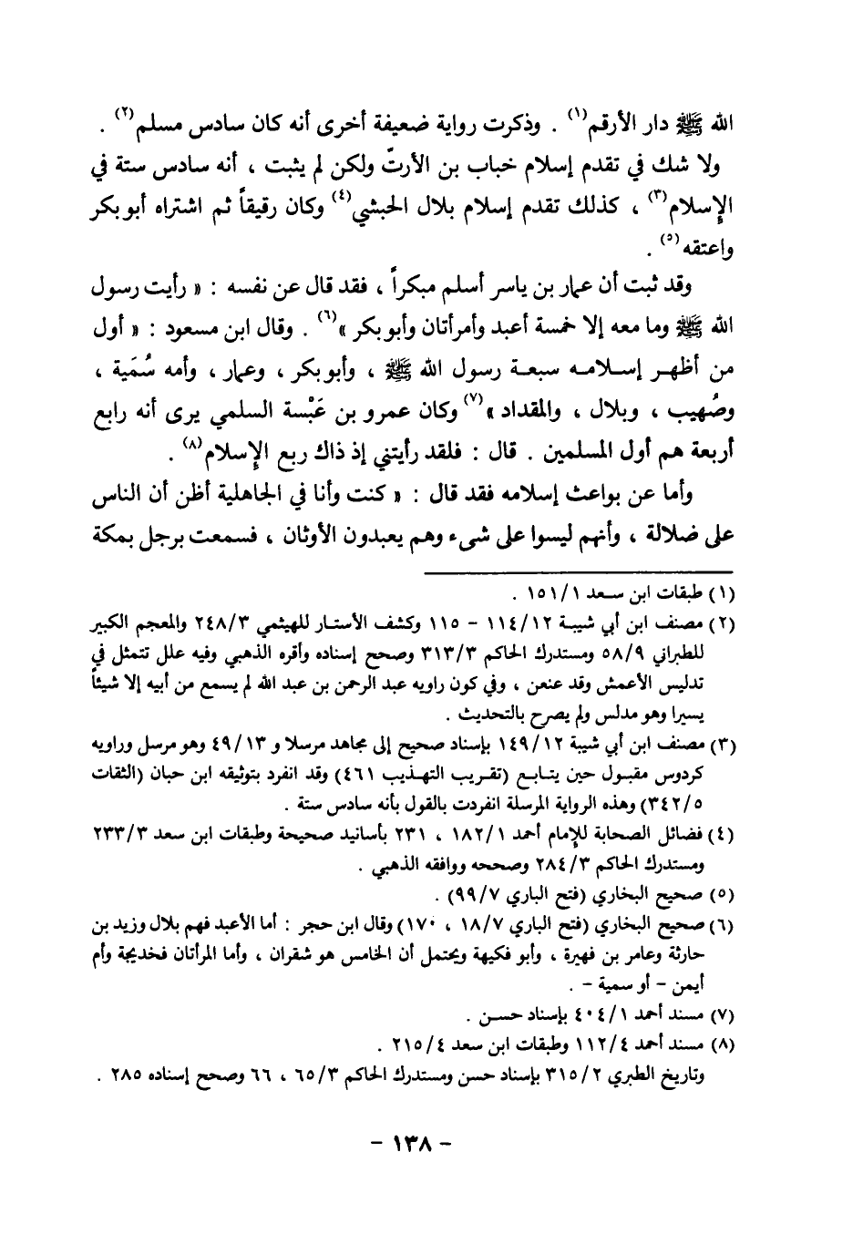 (¬6) صحيح البخاري (فتح الباري 7/ 18، 170) وقال ابن حجر: أما الأعبد فهم بلال وزيد بن حارثة وعامر بن فهيرة، وأبو فكيهة ويحتمل أن الخامس هو شقران، وأما المرأتان فخديجة وأم أيمن -أو سمية-.