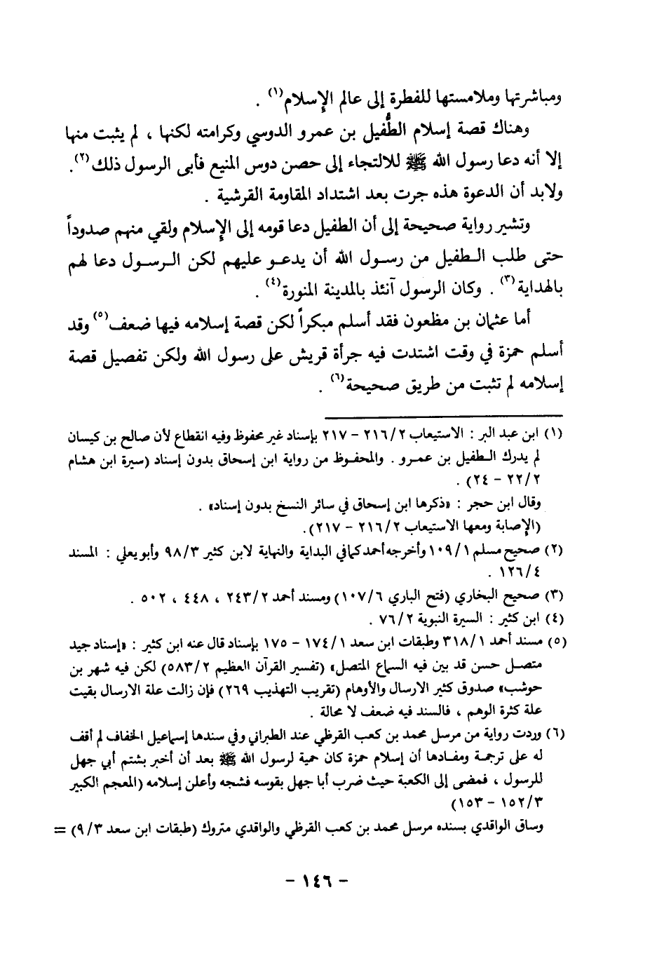 (¬1) ابن عبد البر: الاستيعاب 2/ 216 - 217 بإسناد غير محفوظ وفيه انقطاع لأن صالح بن كيسان لم يدرك الطفيل بن عمرو. والمحفوظ من رواية ابن إسحاق بدون إسناد (سيرة ابن هشام 2/ 22 - 24).