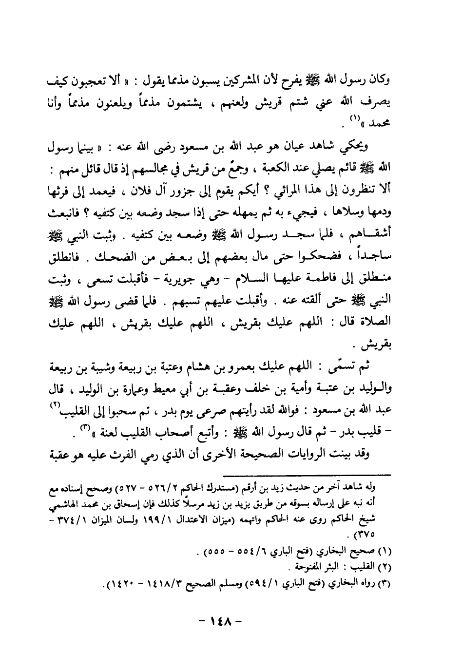 ويحكي شاهد عيان هو عبد الله بن مسعود رضي الله عنه: "بينما رسول الله صلى الله عليه وسلم قائم يصلي عند الكعبة، وجمع من قريش في مجالسهم إذ قال قائل منهم: ألا تنظرون إلى هذا المرائي؟ أيكم يقوم إلى جزور آل فلان، فيعمد إلى فرثها ودمها وسلاها، فيجيء به ثم يمهله حتى إذا سجد وضعه بين كتفيه؟ فانبعث أشقاهم، فلما سجد رسول الله صلى الله عليه وسلم وضعه بين كتفيه. وثبت النبي صلى الله عليه وسلم ساجداً، فضحكوا حتى مال بعضهم إلى بعض من الضحك. فانطلق منطلق إلى فاطمة عليها السلام- وهي جويرية - فأقبلت تسعى وثبت النبي صلى الله عليه وسلم حتى ألقته عنه. وأقبلت عليهم تسبهم. فلما قضى رسول الله صلى الله عليه وسلم الصلاة قال: اللهم عليك بقريش، اللهم عليك بقريش، اللهم عليك بقريش.