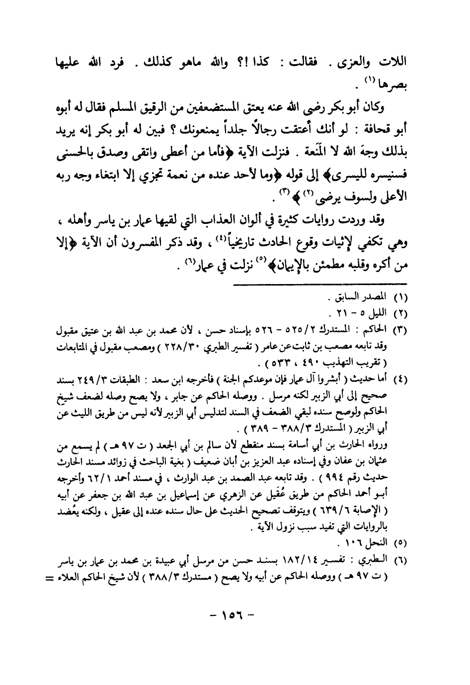 (¬3) الحاكم: المستدرك 2/ 525 - 526 بإسناد حسن، لأن محمد بن عبد الله بن عتيق مقبول وقد تابعه مصعب بن ثابت عن عامر (تفسير الطبري 30/ 228) ومصعب مقبول في المتابعات (تقريب التهذيب 490، 533).