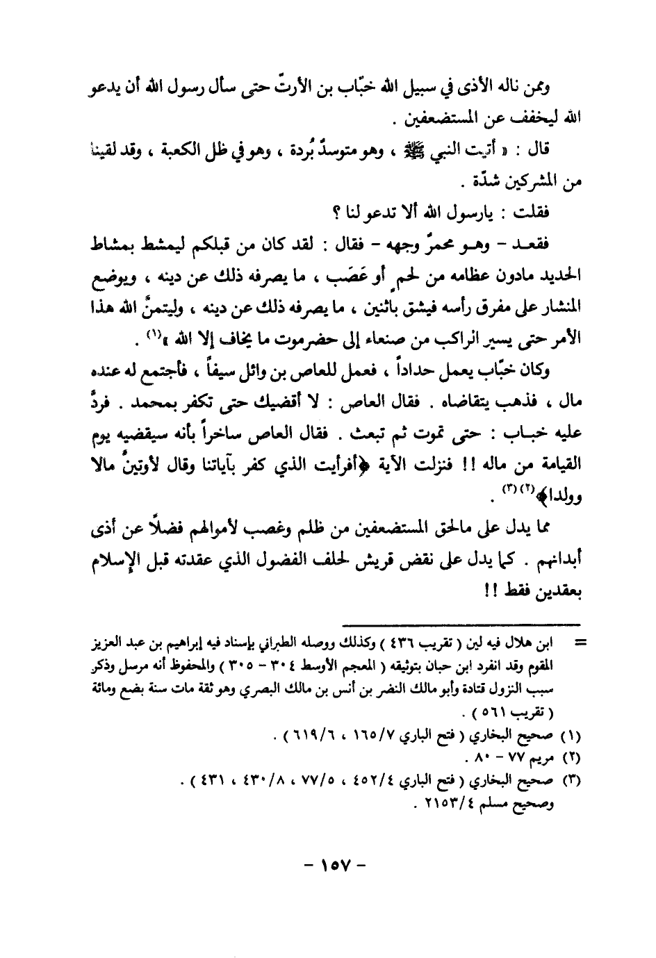 وكان خبّاب يعمل حدادًا، فعمل للعاص بن وائل سيفًا، فاجتمع له عنده مال، فذهب يتقاضاه. فقال العاص: لا أقضيك حتى تكفر بمحمد. فردَّ عليه خباب: حتى تموت ثم تبعث. فقال العاص ساخرًا بأنه سيقضيه يوم القيامة من ماله!! فنزلت الآية {أَفَرَأَيْتَ الَّذِي كَفَرَ بِآيَاتِنَا وَقَالَ لأُوتَيَنَّ مَالا وَوَلَدًا} (¬2) (¬3).