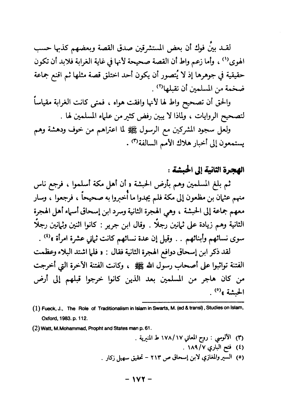 لقد بين فوك أن بعض المستشرقين صدق القصة وبعضهم كذبها حسب الهوى (¬1)، وأما زعم واط أن القصة صحيحة لأنها في غاية الغرابة فلا بد أن تكون حقيقية في جوهرها إذ لا يتصور أن يكون أحد اختلق قصة مثلها ثم اقنع جماعة ضخمة من المسلمين أن تقبلها (¬2).