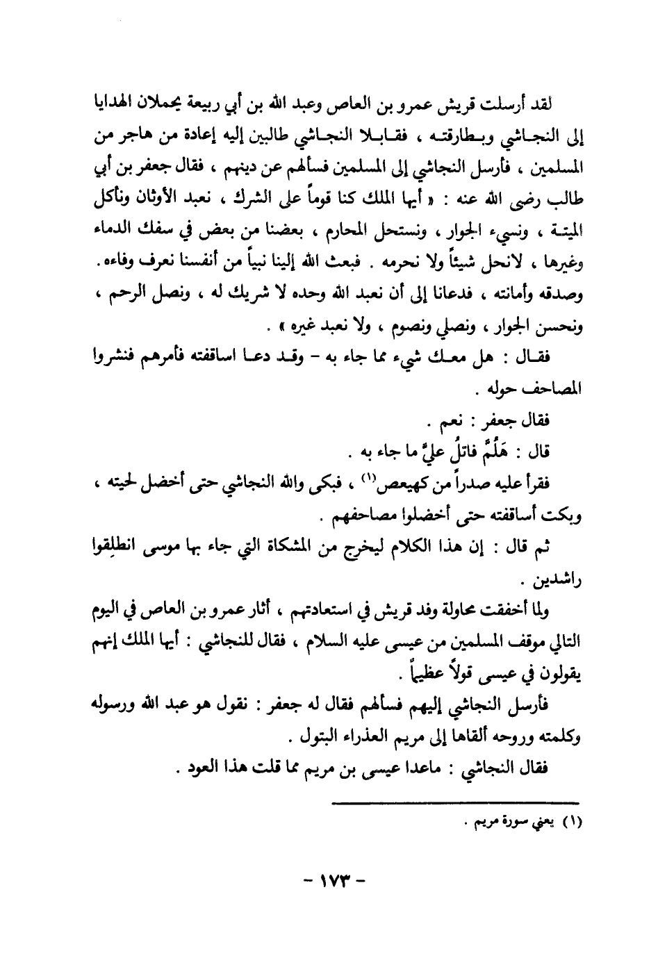 لقد أرسلت قريش عمرو بن العاص وعبد الله بن أبي ربيعة يحملان الهدايا إلى النجاشي وبطارقته، فقابلا النجاشي طالبين إليه إعادة من هاجر من المسلمين، فأرسل النجاشي إلى المسلمين فسألهم عن دينهم، فقال جعفر بن أبي طالب رضي الله عنه: "أيها الملك كنا قوماً على الشرك، نعبد الأوثان ونأكل الميتة، ونسئ الجوار، ونستحل المحارم، بعضنا من بعض في سفك الدماء وغيرها، لا نحل شيئاً ولا نحرمه. فبعث الله إلينا نبياً من أنفسنا نعرف وفاءه وصدقه وأمانته، فدعانا إلى أن نعبد الله وحده لا شريك له، ونصل الرحم، ونحسن الجوار، ونصلي ونصوم، ولا نعبد غيره".