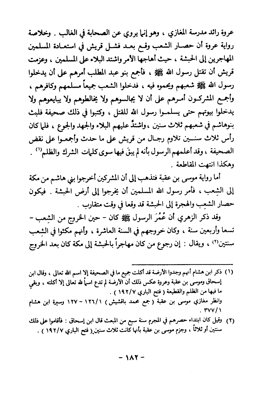 عروة رائد مدرسة المغازي، وهو إنما يروي عن الصحابة في الغالب. وخلاصة رواية عروة أن حصار الشعب وقع بعد فشل قريش في استعادة المسلمين المهاجرين إلى الحبشة، حيث أهاجها الأمر واشتد البلاء على المسلمين، وعزمت قريش أن تقتل رسول الله صلى الله عليه وسلم، فأجمع بنو عبد المطلب أمرهم على أن يدخلوا رسول الله صلى الله عليه وسلم شعبهم ويحموه فيه، فدخلوا الشعب جميعاً مسلمهم وكافرهم، وأجمع المشركون أمرهم على أن لا يجالسوهم ولا يخالطوهم ولا يبايعوهم ولا يدخلوا بيوتهم حتى يسلموا رسول الله للقتل، وكتبوا في ذلك صحيفة فلبث بنو هاشم في شعبهم ثلاث سنين، واشتد عليهم البلاء والجهد والجوع، فلما كان رأس ثلاث سنين تلاوم رجال من قريش على ما حدث وأجمعوا على نقض الصحيفة، وقد أعلمهم الرسول بأنه لم يبق فيها سوى كلمات الشرك والظلم (¬1). وهكذا انتهت المقاطعة.