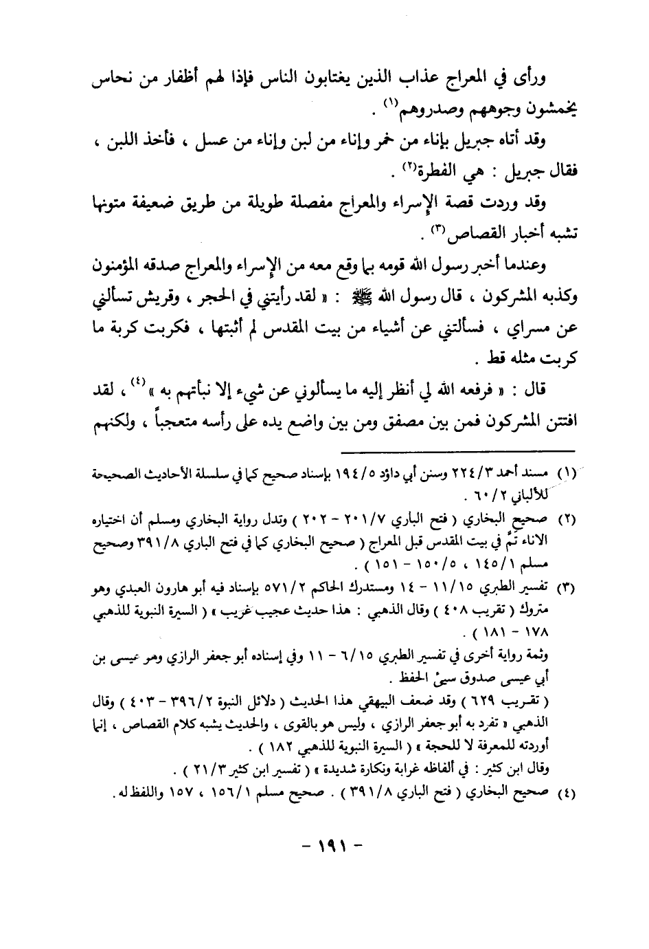 (¬2) صحيح البخاري (فتح الباري 7/ 201 - 202) وتدل رواية البخاري ومسلم أن اختياره الإناء تم في بيت المقدس قبل المعراج (صحيح البخاري كما في فتح الباري 8/ 391 وصحيح مسلم 1/ 145، 5/ 150 - 151).