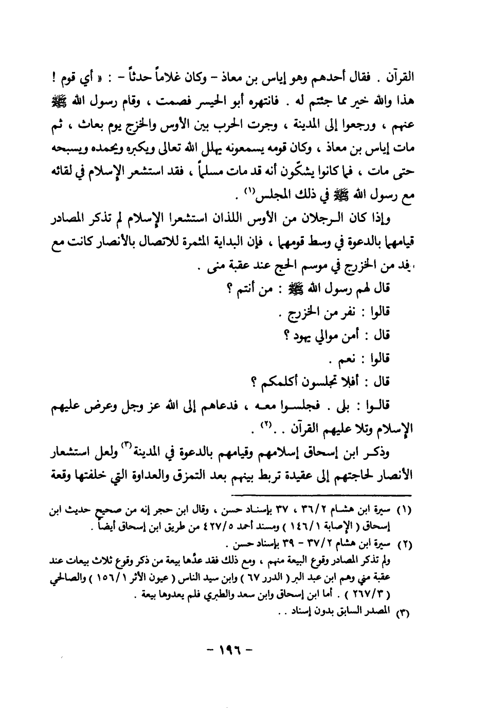 (¬1) سيرة ابن هشام 2/ 63، 37 بإسناد حسن، وقال ابن حجر إنه من صحيح حديث ابن إسحاق (الإصابة 1/ 146) ومسند أحمد 5/ 427 من طريق ابن إسحاق أيضاً.