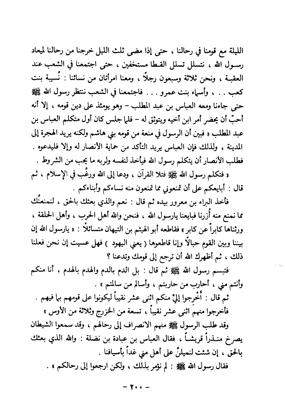 الليلة مع قومنا في رحالنا، حتى إذا مضى ثلث الليل خرجنا من رحالنا لميعاد رسول الله، نتسلل تسلل القطا مستخفين، حتى اجتمعنا في الشعب عند العقبة، ونحن ثلاثة وسبعين رجلاً، ومعنا امرأتان من نسائنا: نسيبة بنت كعب .. ، وأسماء بنت عمرو ... فاجتمعنا في الشعب ننتظر رسول الله صلى الله عليه وسلم حتى جاءنا ومعه العباس ابن عبد المطلب - وهو يومئذ على دين قومه، إلا أنه أحبّ أن يحضر أمر ابن أخيه ويتوثق له - فلما جلس كان أول متكلم العباس بن عبد المطلب "فبين أن الرسول في منعة من قومه بني هاشم ولكنه يريد الهجرة إلى المدينة، ولذلك فإن العباس يريد التأكد من حماية الأنصار له وإلا فليدعوه. فطلب الأنصار أن يتكلم رسول الله فيأخذ لنفسه ولربه ما يحب من الشروط.