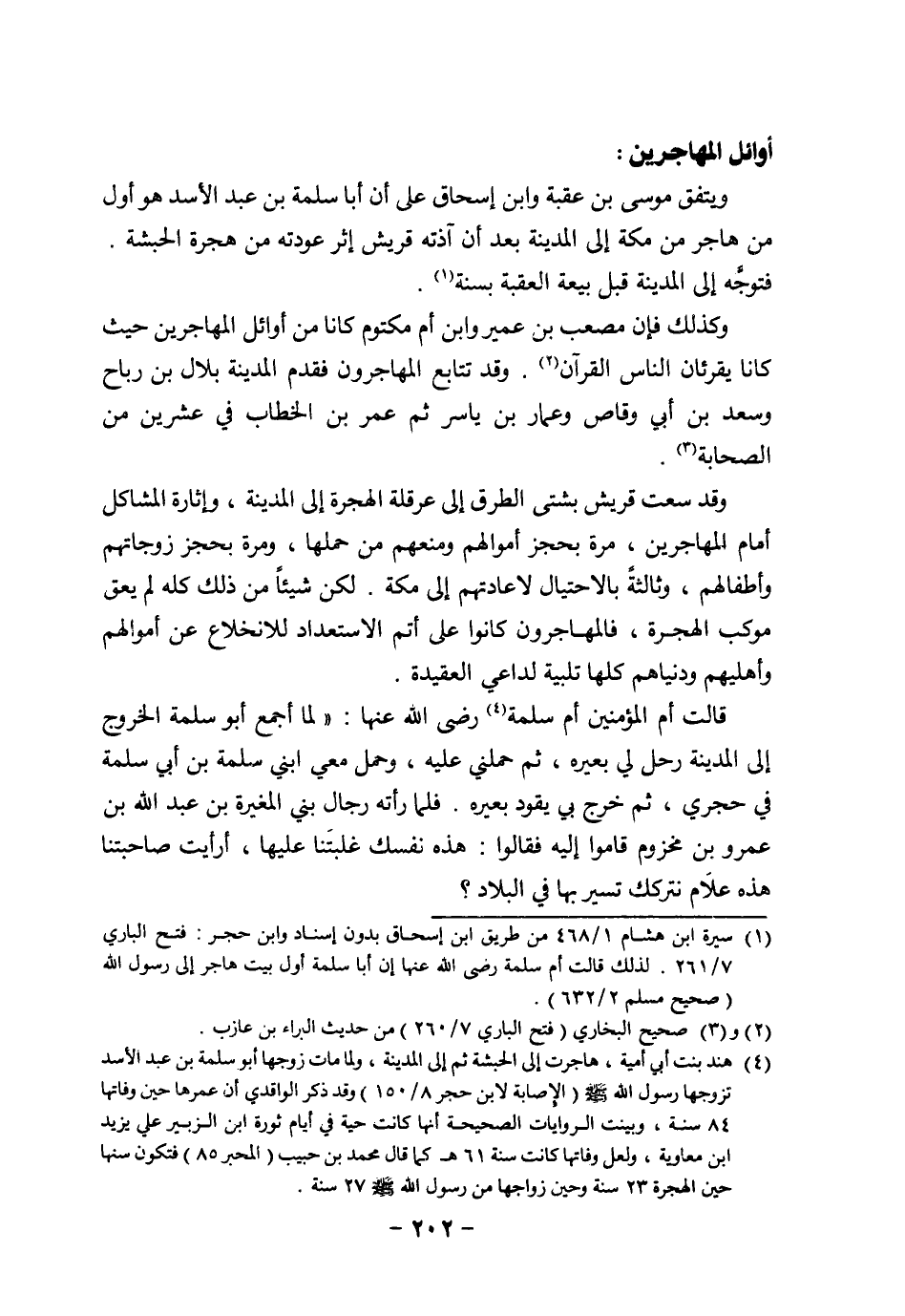 (¬1) سيرة ابن هشام 1/ 468 من طريق ابن إسحاق بدون إسناد وابن حجر: فتح الباري 7/ 261. لذلك قالت أم سلمة رضي الله عنها إن أبا سلمة أول بيت هاجر إلى رسول الله (صحيح مسلم 2/ 632).