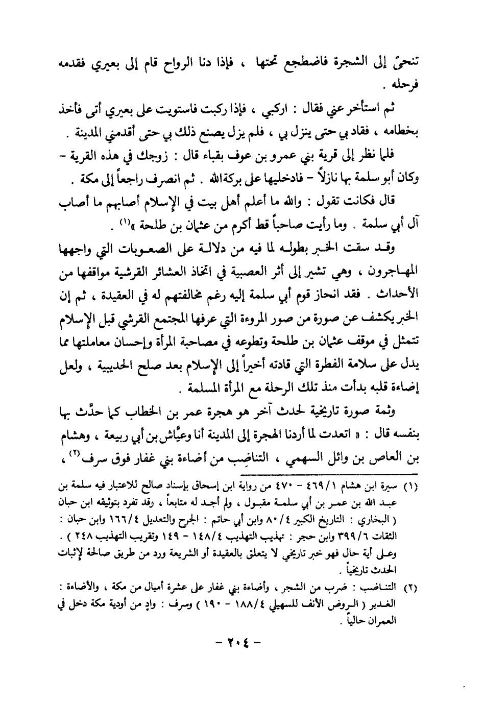 (¬1) سيرة ابن هشام 1/ 469 - 470 من رواية ابن إسحاق بإسناد صالح للاعتبار فيه سلمة بن عبد الله بن عمر بن أبي سلمة مقبول، ولم أجد له متابعاً، وقد تفرد بتوثيقه ابن حبان (البخاري: التاريخ الكبير 4/ 80 وابن أبي حاتم: الجرح والتعديل 4/ 166 وابن حبان: الثقات 6/ 399 وابن حجر: تهذيب التهذيب 4/ 148 - 149 وتقريب التهذيب 248). وعلى أية حال فهو خبر تاريخي لا يتعلق بالعقيدة أو الشريعة ورد من طريق صالحة لإثبات الحدث تاريخياً.