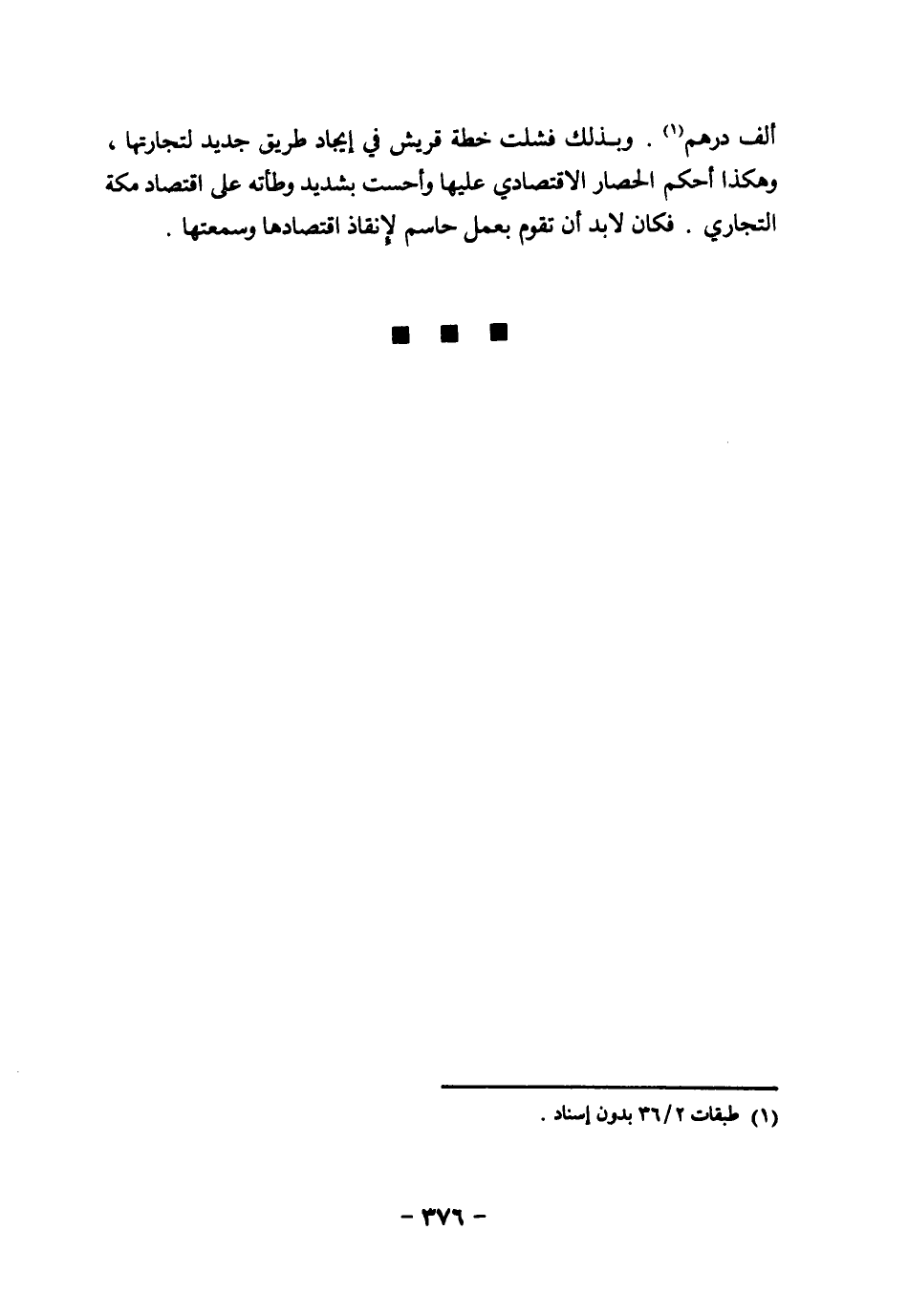 ألف درهم (¬1). وبذلك فشلت خطة قريش في إيجاد طريق جديد لتجارتها، وهكذا أحكم الحصار الاقتصادي عليها وأحست بشديد وطأته على اقتصاد مكة التجاري. فكان لابد أن تقوم بعمل حاسم لإنقاذ اقتصادها وسمعتها.