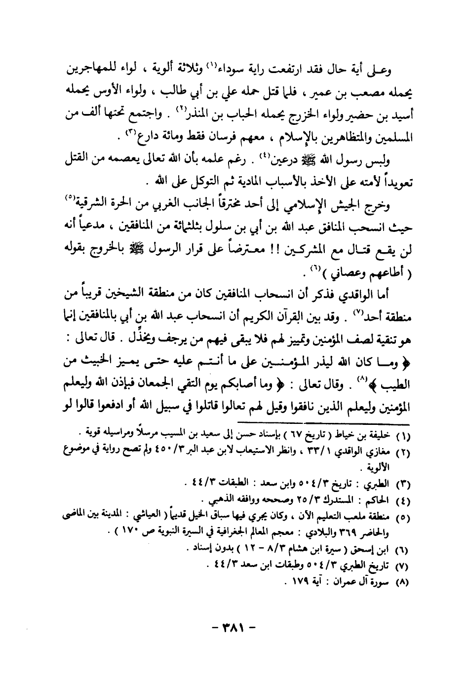 أما الواقدي فذكر أن انسحاب المنافقين كان من منطقة الشيخين قريبا من منطقة أحد (¬7). وقد بين القرآن الكريم أن انسحاب عبد الله بن أبي بالمنافقين إنما هو تنقية لصف المؤمنين وتمييز لهم فلا يبقى فيهم من يرجف ويخذل. قال تعالى: {مَا كَانَ اللَّهُ لِيَذَرَ الْمُؤْمِنِينَ عَلَى مَا أَنْتُمْ عَلَيْهِ حَتَّى يَمِيزَ الْخَبِيثَ مِنَ الطَّيِّبِ} (¬8). وقال تعالى: {وَمَا أَصَابَكُمْ يَوْمَ الْتَقَى الْجَمْعَانِ فَبِإِذْنِ اللَّهِ وَلِيَعْلَمَ الْمُؤْمِنِينَ (166) وَلِيَعْلَمَ الَّذِينَ نَافَقُوا وَقِيلَ لَهُمْ تَعَالَوْا قَاتِلُوا فِي سَبِيلِ اللَّهِ أَوِ ادْفَعُوا قَالُوا لَوْ