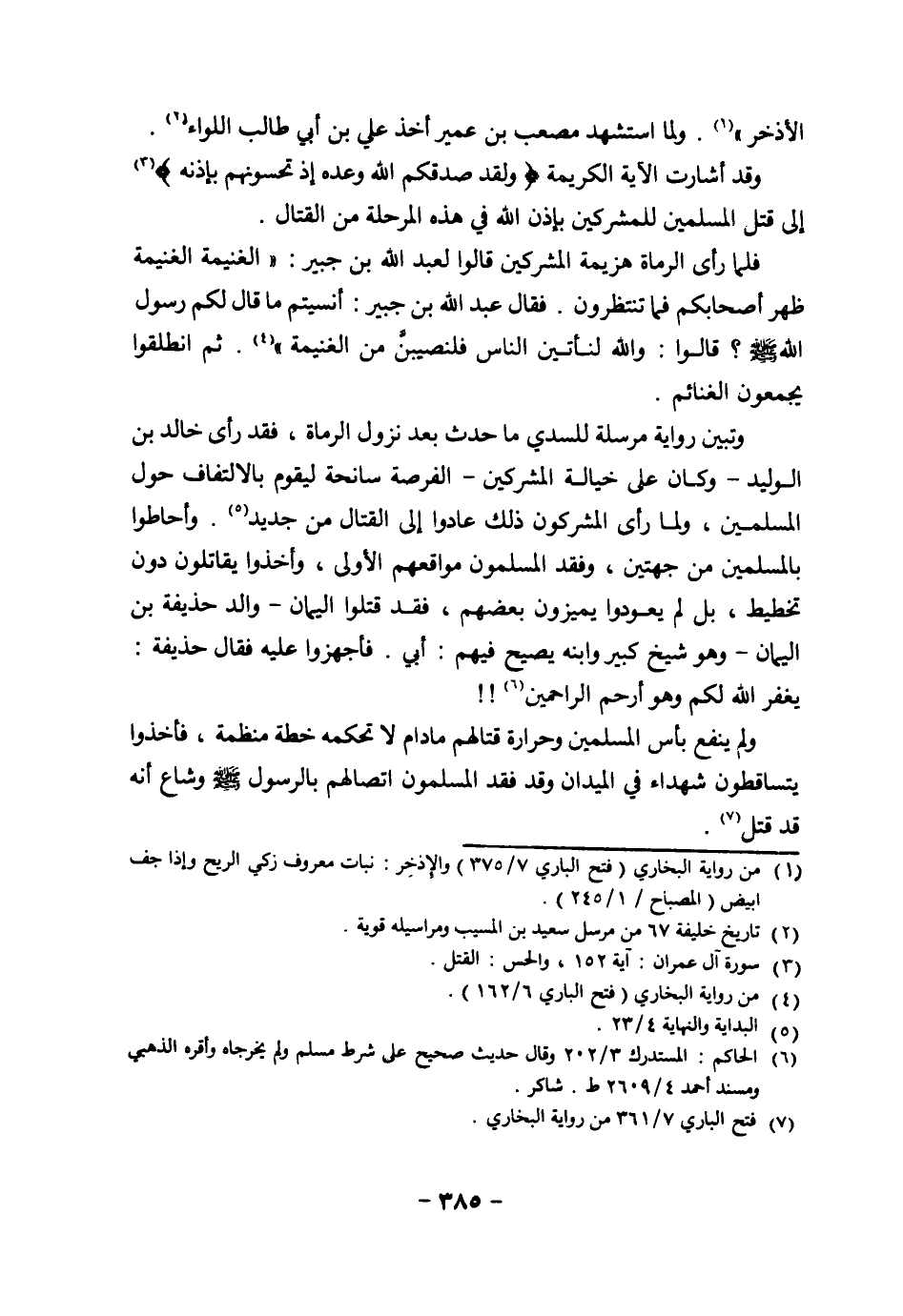 الأذخر" (¬1).ولما استشهد مصعب بن عمير أخذ علي بن أبي طالب اللواء (¬2). وقد أشارت الآية الكريمة {وَلَقَدْ صَدَقَكُمُ اللَّهُ وَعْدَهُ إِذْ تَحُسُّونَهُمْ بِإِذْنِهِ} (¬3) إلى قتل المسلمين للمشركين بإذن الله في هذه المرحلة من القتال.
