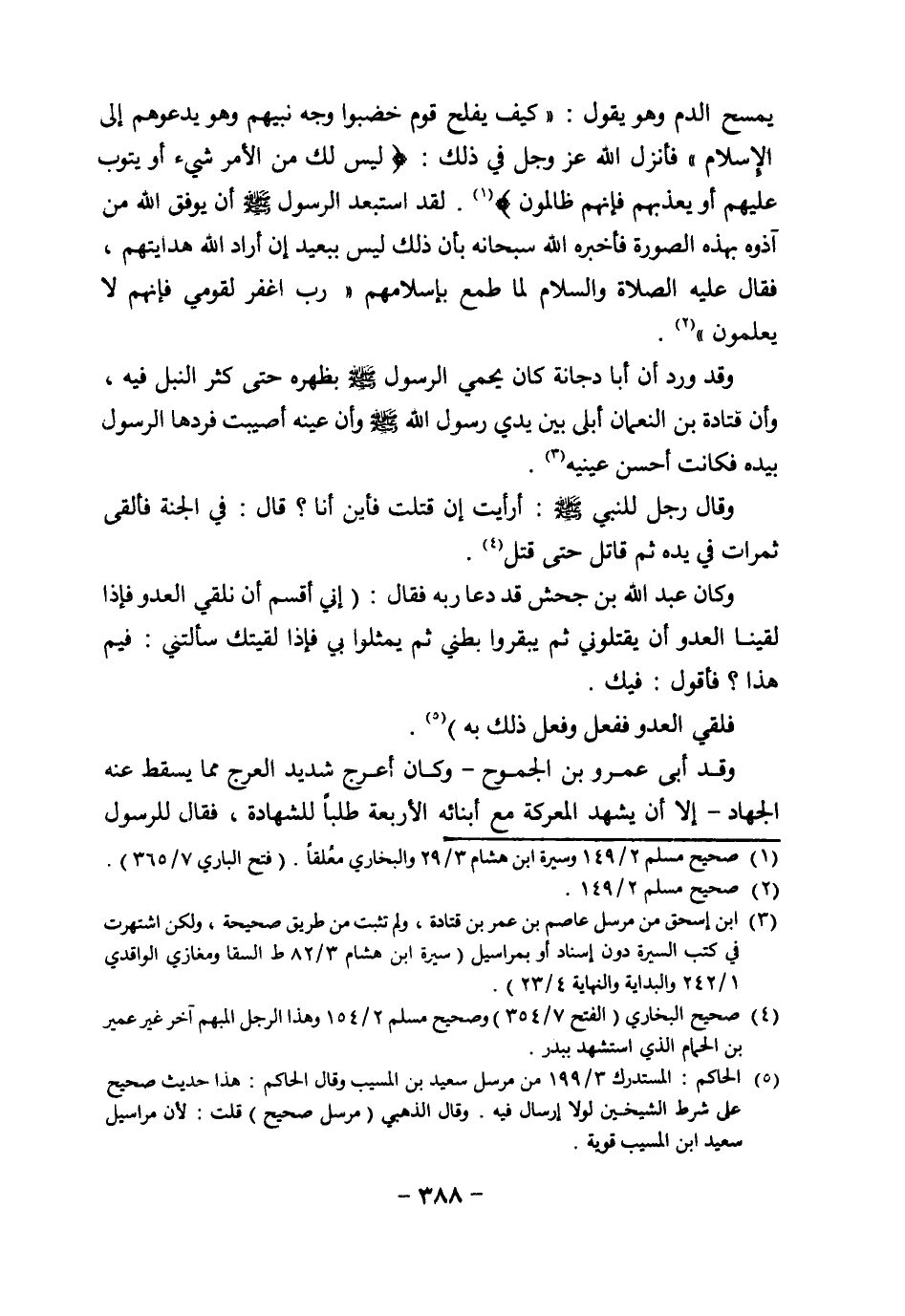 (¬4) صحيح البخاري (الفتح 7/ 354) وصحيح مسلم 2/ 154 وهذا الرجل المبهم آخر غير عمير بن الحمام الذي استشهد ببدر.