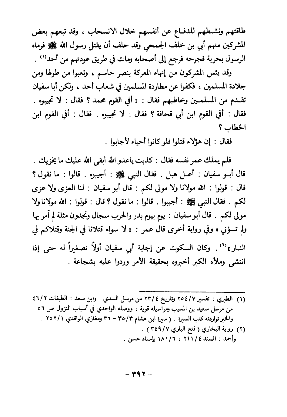 قال أبو سفيان: أعل هبل. فقال النبي صلى الله عليه وسلم: أجيبوه. قالوا: ما نقول؟ قال: قولوا: الله مولانا ولا مولى لكم. قال أبو سفيان: لنا العزى ولا عزى لكم. فقال النبي صلى الله عليه وسلم: أجيبوا. قالوا: ما نقول؟ قال: قولوا: الله مولانا ولا مولى لكم. قال أبو سفيان: يوم بيوم بدر والحرب سجال وتجدون مثلة لم آمر بها ولم تسؤني" وفي رواية أخرى قال عمر: "لا سواء قتلانا في الجنة وقتلاكم في النار" (¬2). وكان السكوت عن إجابة أبي سفيان أولا تصغيرا له حتى إذا انتشى وملأه الكبر أخبروه بحقيقة الأمر وردوا عليه بشجاعة.