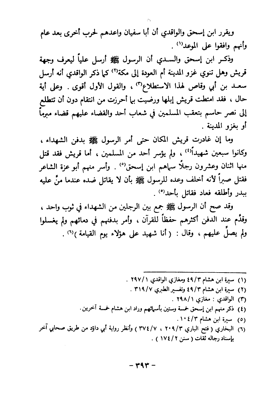 وذكر ابن إسحق والسدي أن الرسول صلى الله عليه وسلم أرسل علياً ليعرف وجهة قريش وهل تنوي غزو المدينة أم العودة إلى مكة (¬2) كما ذكر الواقدي أنه أرسل سعد بن أبي وقاص لهذا الاستطلاع (¬3)، والقول الأول أقوى. وعلى أية حال، فقد امتطت قريش إبلها ورضيت بما أحرزت من انتقام دون أن تتطلع إلى نصر حاسم بتعقب المسلمين في شعاب أحد والقضاء عليهم قضاء مبرماً أو بغزو المدينة.