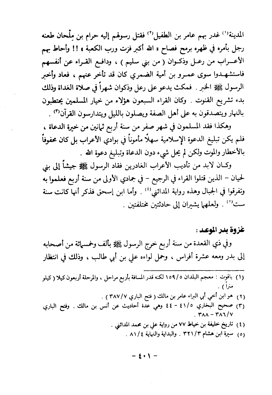 المدينة (¬1) غدر بهم عامر بن الطفيل (¬2) فقتل رسولهم إليه حرام بن ملحان طعنه رجل بأمره في ظهره برمح فصاح "الله أكبر فزت ورب الكعبة"!! وأحاط بهم الأعراب من رعل وذكوان (من بني سليم)، ودافع القراء عن أنفسهم فاستشهدوا سوى عمرو بن أمية الضمري كان قد تأخر عنهم، فعاد وأخبر الرسول صلى الله عليه وسلم الخبر. فمكث يدعو على رعل وذكوان شهراً في صلاة الغداة وذلك بدء تشريع القنوت. وكان القراء السبعون هؤلاء من خيار المسلمين يحتطبون بالنهار ويتصدقون به على أهل الصفة ويصلون بالليل ويتدارسون القرآن (¬3).