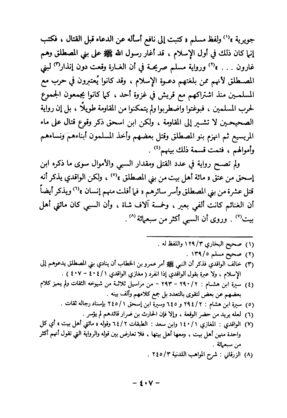 جويرية" (¬1) ولفظ مسلم "كتبت إلى نافع أسأله عن الدعاء قبل القتال، فكتب إنما كان ذلك في أول الإسلام، وقد أغار رسول الله صلى الله عليه وسلم على بني المصطلق وهم غارون ... " (¬2) ورواية مسلم صريحة في أن الغارة وقعت دون إنذار (¬3) لبني المصطلق لأنهم ممن بلغتهم دعوة الإسلام، وقد كانوا يعتبرون في حرب مع المسلمين منذ اشتراكهم مع قريش في غزوة أحد، كما كانوا يجمعون الجموع لحرب المسلمين، فبوغتوا واضطربوا ولم يتمكنوا من المقاومة طويلاً، بل إن رواية الصحيحين لا تشير إلى المقاومة، ولكن ابن إسحق ذكر وقوع قتال على ماء المريسيع ثم انهزم بنو المصطلق وقتل بعضهم وأخذ المسلمون أبناءهم ونساءهم وأموالهم، فتمت قسمة ذلك بينهم (¬4).