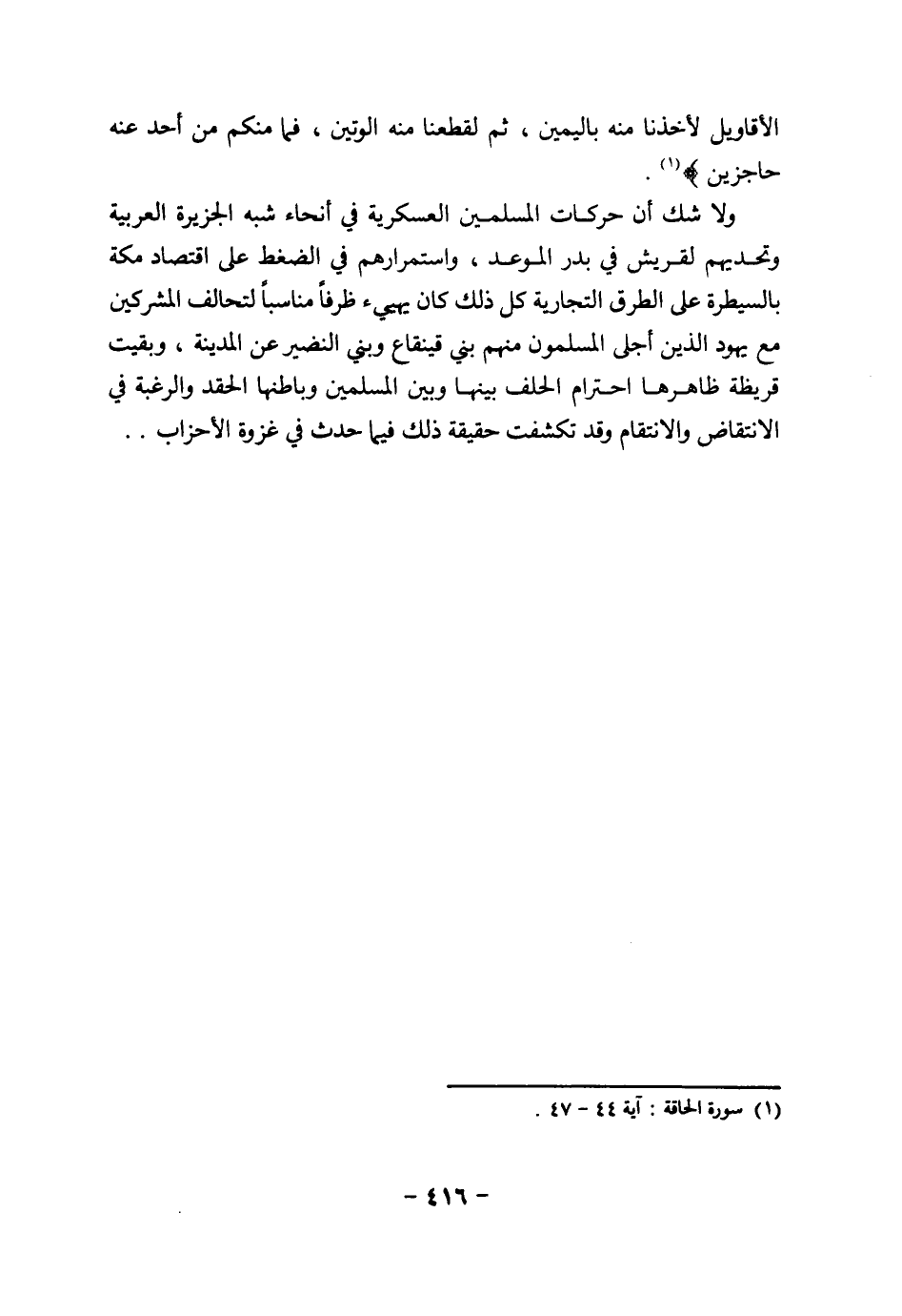 الْأَقَاوِيلِ (43) لَأَخَذْنَا مِنْهُ بِالْيَمِينِ (45) ثُمَّ لَقَطَعْنَا مِنْهُ الْوَتِينَ (46) فَمَا مِنْكُمْ مِنْ أَحَدٍ عَنْهُ حَاجِزِينَ} (¬1).
