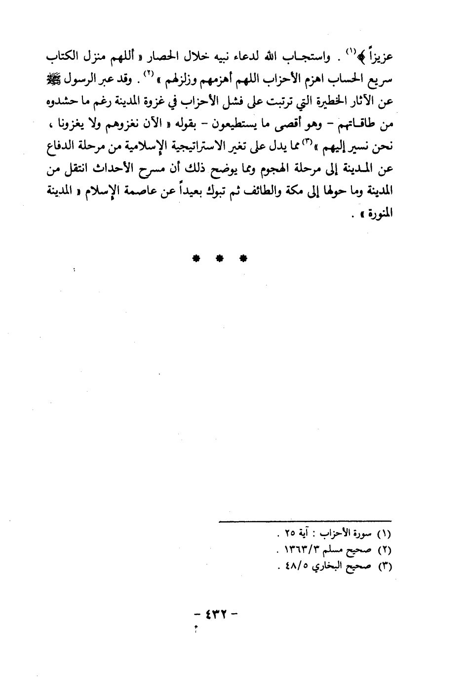 عَزِيزًا} (¬1). واستجاب الله لدعاء نبيه خلال الحصار "أللهم منزل الكتاب سريع الحساب اهزم الأحزاب اللهم اهزمهم وزلزلهم" (¬2). وقد عبر الرسول صلى الله عليه وسلم عن الآثار الخطيرة التي ترتبت على فشل الأحزاب في غزوة المدينة رغم ما حشدوه من طاقاتهم- وهو أقصى ما يستطيعون- بقوله "الآن نغزوهم ولا يغزونا، نحن نسير إليهم" (¬3) مما يدل على تغير الاستراتيجية الإسلامية من مرحلة الدفاع عن المدينة إلى مرحلة الهجوم ومما يوضح ذلك أن مسرح الأحداث انتقل من المدينة وما حولها إلى مكة والطائف ثم تبوك بعيداً عن عاصمة الإسلام "المدينة المنورة".