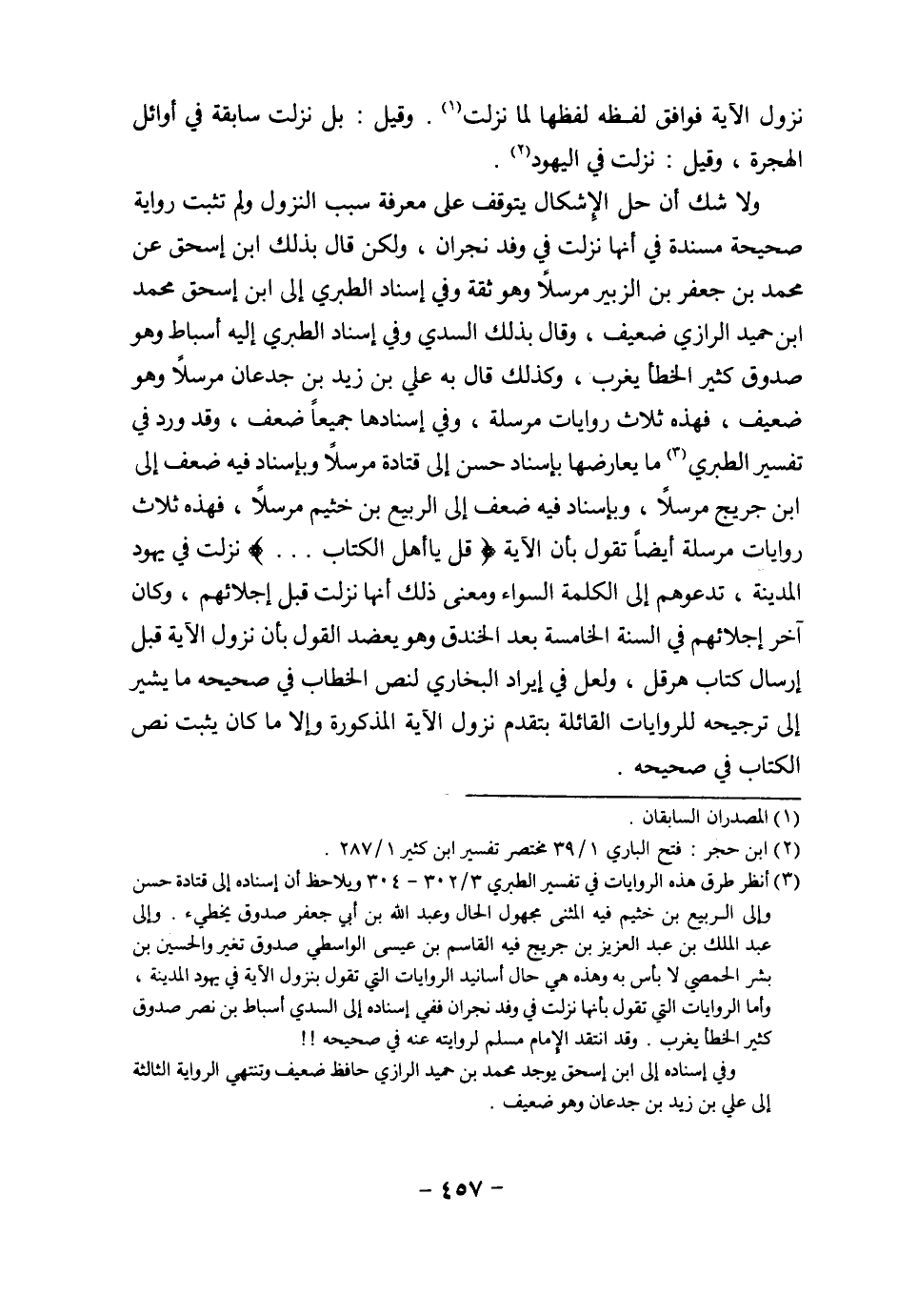 (¬3) انظر طرق هذه الروايات في تفسير الطبري 3/ 302 - 304 ويلاحظ أن إسناده إلى قتادة حسن وإلى الربيع بن خثيم فيه المثنى مجهول الحال وعبد الله بن أبي جعفر صدوق يخطئ. وإلى عبد الملك بن عبد العزيز بن جريج فيه القاسم بن عيسى الواسطي صدوق تغير والحسين بن بشر الحمصي لا بأس به وهذه هي حال أسانيد الروايات التي تقول بنزول الآية في يهود المدينة، وأما الروايات التي تقول بأنها نزلت في وفد نجران ففي إسناده إلى السدي أسباط بن نصر صدوق كثير الخطأ يغرب. وقد انتقد الإمام مسلم لروايته عنه في صحيحه!!