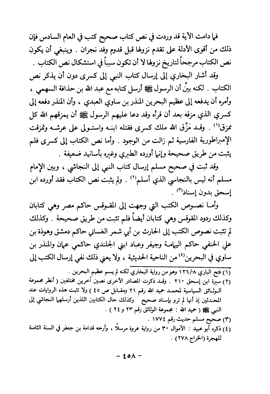 وأما نصوص الكتب التي وجهت إلى المقوقس حاكم مصر وهي كتابان وكذلك ردود المقوقس وهي كتابان أيضا فلم تثبت من طريق صحيحة. وكذلك لم تثبت نصوص الكتب إلى الحارث بن أبي شمر الغساني حاكم دمشق وهوذة بن علي الحنفي حاكم اليمامة وجيفر وعباد ابني الجلندي حاكمي عمان والمنذر بن ساوي في البحرين (¬4) من الناحية الحديثية، ولا يعني ذلك نفي إرسال الكتب إلى