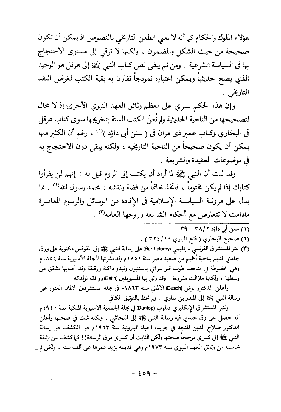 ونشر المستشرق الإنكليزي دنلوب (Dunlop) في مجلة الجمعية الآسيوية الملكية سنة 1940 م أنه حصل على رق جلدي فيه رسالة النبي صلى الله عليه وسلم إلى النجاشي. ولكنه شك في صحتها وأعلن الدكتور صلاح الدين المنجد في جريدة الحياة البيروتية سنة 1963 م عن الكشف عن رسالة النبي صلى الله عليه وسلم إلى كسرى مرجحا صحتها ولكن الثابت أن كسرى مزق الرسالة!! كما كشف عن وثيقة خاصة من وثائق العهد النبوي سنة 1973 م وهي قديمة يزيد عمرها على ألف سنة، ولكن لم =