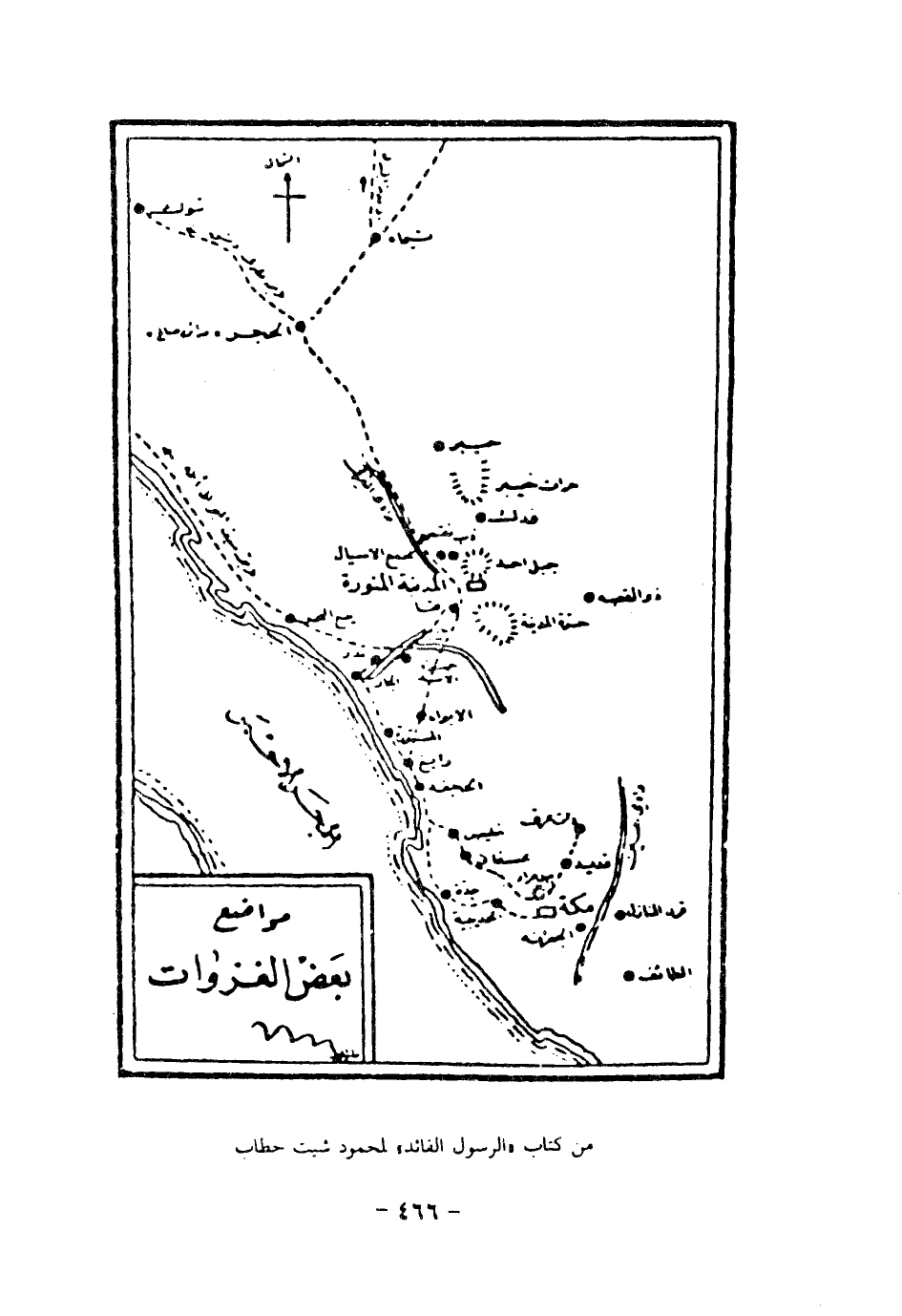 (صورة لمواضع بعض الغزوات من كتاب الرسول القائد لمحمود شيث).