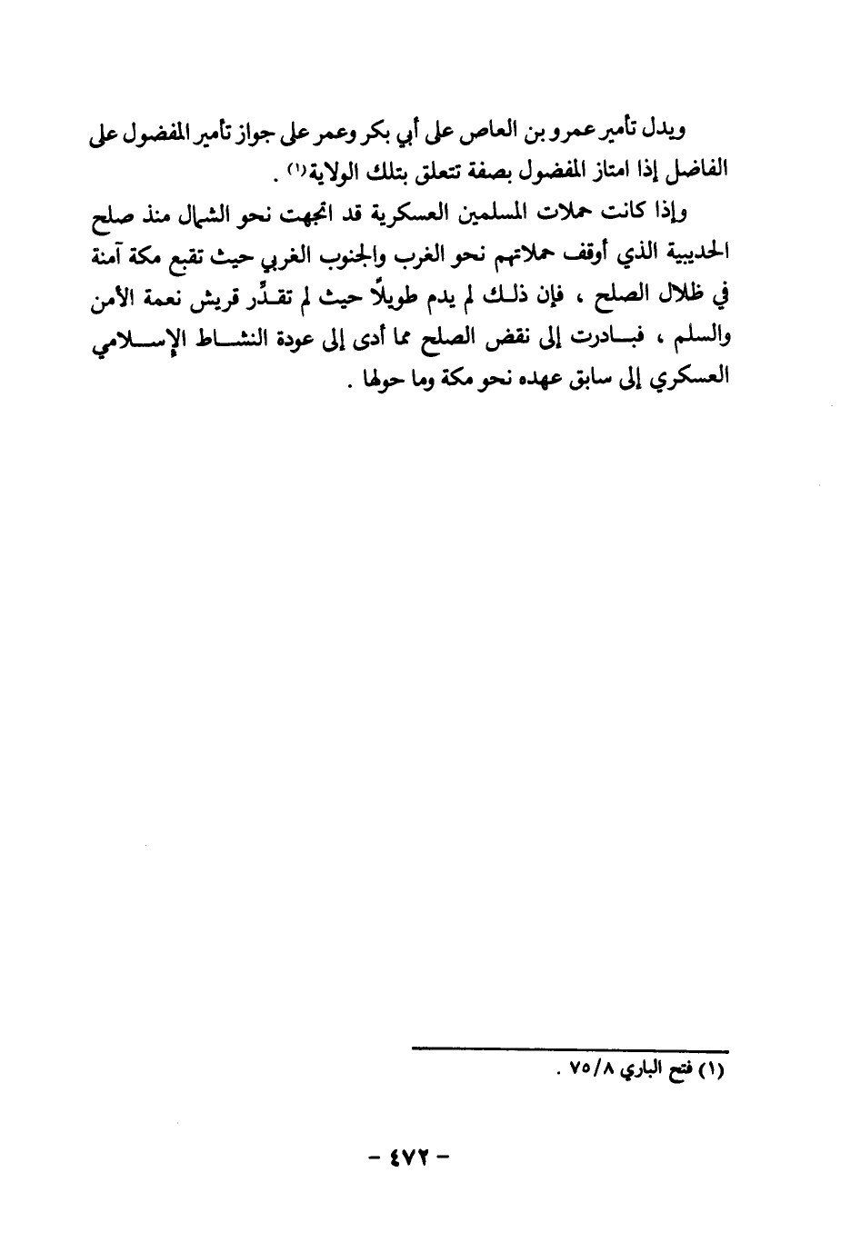 ويدل تأمير عمرو بن العاص على أبي بكر وعمر على جواز تأمير المفضول على الفاضل إذا امتاز المفضول بصفة تتعلق بتلك الولاية (¬1).