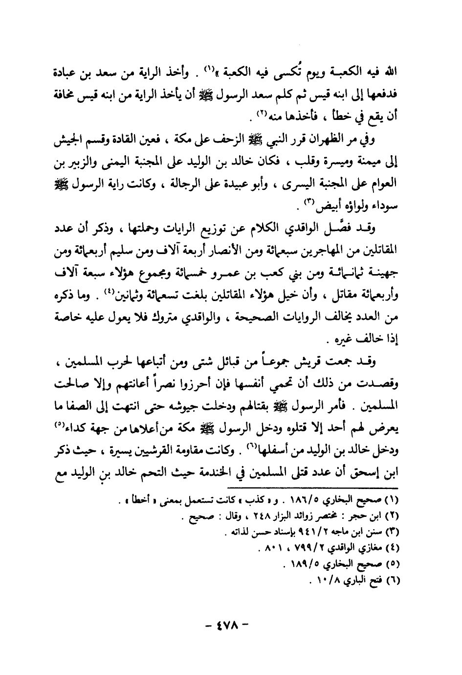 وقد فصَّل الواقدي الكلام عن توزيع الرايات وحملتها، وذكر أن عدد المقاتلين من المهاجرين سبعمائة ومن الانصار أربعة آلاف ومن سليم أربعمائة ومن جهينة ثمانمائة ومن بني كعب بن عمرو خمسمائة ومجموع هؤلاء سبعة آلاف وأربعمائة مقاتل، وأن خيل هؤلاء المقاتلين بلغت تسعمائة وثمانين (¬4). وما ذكره من العدد يخالف الروايات الصحيحة والواقدي متروك فلا يعول عليه خاصة إذا خالف غيره.