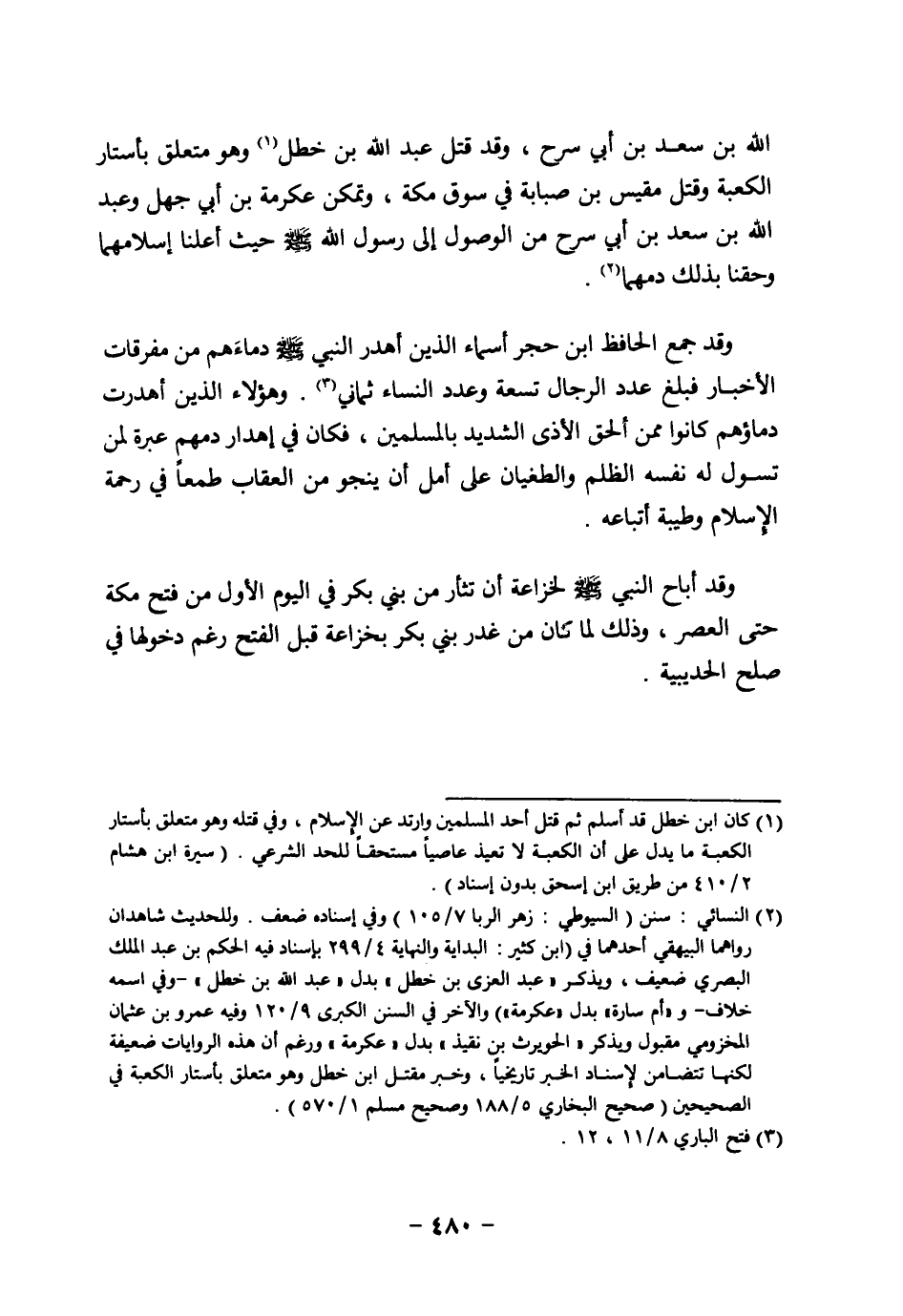 (¬2) النسائي: سنن (السيوطي: زهر الربا 7/ 105) وفي إسناده ضعف. وللحديث شاهدان رواهما البيهقي أحدهما في (ابن كثير: البداية والنهاية 4/ 299 بإسناد فيه الحكم بن عبد الملك البصري ضعيف. ويذكر "عبد العزى بن خطل" بدل " عبد الله بن خطل" - وفي اسمه خلاف- و "أم سارة" بدل "عكرمة") والآخر في السنن الكبرى 9/ 120 وفيه عمرو بن عثمان المخزومي مقبول ويذكر "الحويرث بن نقيذ" بدل "عكرمة" ورغم أن هذه الروايات ضعيفة لكنهما تتضامن لإسناد الخبر تاريخياً، وخبر مقتل ابن خطل وهو متعلق بأستار الكعبة في الصحيحين (صحيح البخاري 5/ 188 وصحيح مسلم 1/ 570).