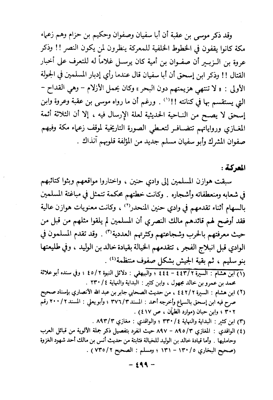 وقد ذكر موسى بن عقبة أن أبا سفيان وصفوان وحكيم بن حزام وهم زعماء مكة كانوا يقفون في الخطوط الخلفية للمعركة ينظرون لمن يكون النصر!! وذكر عروة بن الزبير أن صفوان بن أمية كان يرسل غلاماً له للتعرف على أخبار القتال!! وذكر ابن إسحق أن أبا سفيان قال عندما رأى إدبار المسلمين في الجولة الأولى: "لا تنتهي هزيمتهم دون البحر" وكان يحمل الأزلام -وهي القداح- التي يستقسم بها في كنانته!! (¬1). ورغم أن ما رواه موسى بن عقبة وعروة وابن إسحق لا يصح من الناحية الحديثية لعلة الإرسال فيه، إلا أن الثلاثة أئمة المغازي ورواياتهم تتضافر لتعطي الصورة التاريخية لموقف زعماء مكة وفيهم صفوان المشرك وأبو سفيان مسلم جديد من المؤلفة قلوبهم آنذاك.