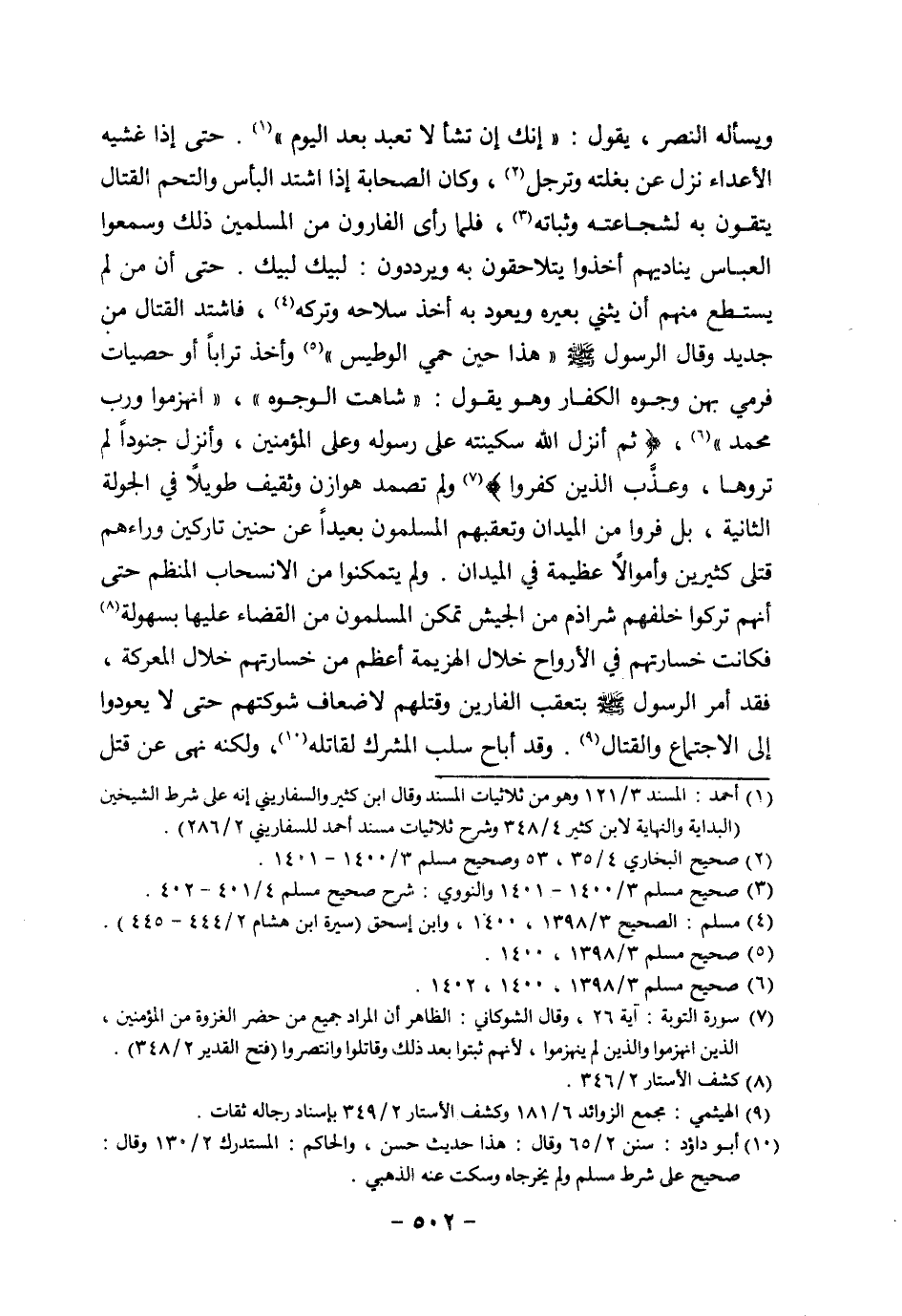 ويسأله النصر، يقول: "إنك إن تشأ لا تبعد بعد اليوم" (¬1). حتى إذا غشيه الأعداء نزل عن بغلته وترجل (¬2)، وكان الصحابة إذا اشتد البأس والتحم القتال يتقون به لشجاعته وثباته (¬3)، فلما رأى الفارون من المسلمين ذلك وسمعوا العباس يناديهم أخذوا يتلاحقون به ويرددون: لبيك لبيك. حتى أن من لم يستطع منهم أن يثني بعيره ويعود به أخذ سلاحه وتركه (¬4)، فاشتد القتال من جديد وقال الرسول صلى الله عليه وسلم "هذا حين حمي الوطيس" (¬5) وأخذ تراباً أو حصيات فرمى بهن وجوه الكفار وهو يقول:"شاهت الوجوه", "انهزموا ورب محمد" (¬6)، {ثُمَّ أَنْزَلَ اللَّهُ سَكِينَتَهُ عَلَى رَسُولِهِ وَعَلَى الْمُؤْمِنِينَ وَأَنْزَلَ جُنُودًا لَمْ تَرَوْهَا وَعَذَّبَ الَّذِينَ كَفَرُوا} (¬7) ولم تصمد هوازن وثقيف طويلاً في الجولة الثانية، بل فروا من الميدان وتعقبهم المسلمون بعيداً عن حنين تاركين وراءهم قتلى كثيرين وأموالاً عظيمة في الميدان. ولم يتمكنوا من الانسحاب المنظم حتى أنهم تركوا خلفهم شراذم من الجيش تمكن المسلمون من القضاء عليها بسهولة (¬8) فكانت خسارتهم في الأرواح خلال الهزيمة أعظم من خسارتهم خلال المعركة فقد أمر الرسول صلى الله عليه وسلم بتعقب الفارين وقتلهم لإضعاف شوكتهم حتى لا يعودوا إلى الاجتماع والقتال (¬9). وقد أباح سلب المشرك لقاتله (¬10) ولكنه نهى عن قتل