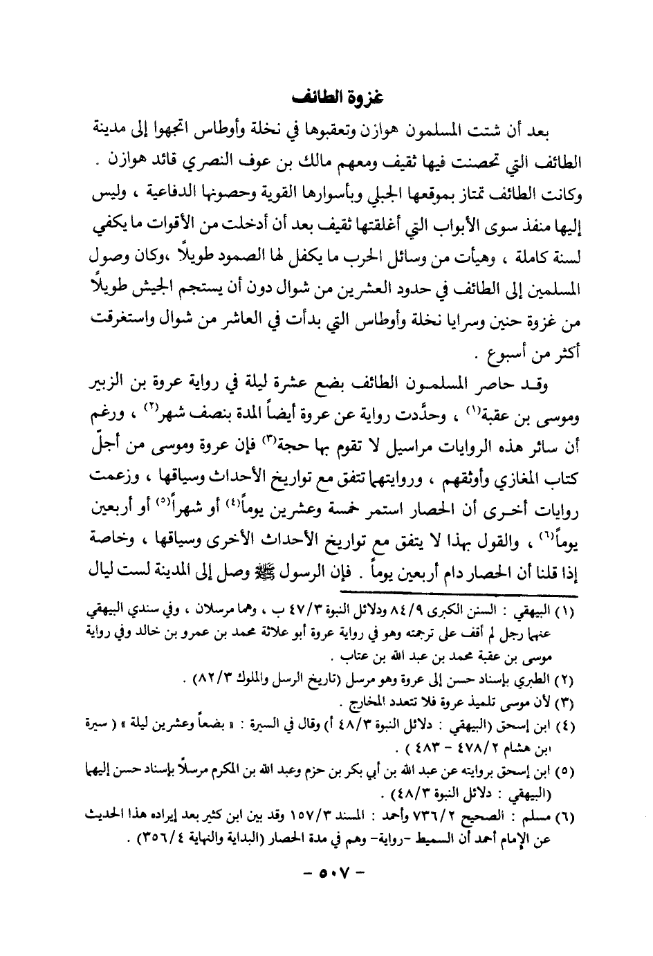 وقد حاصر المسلمون الطائف بضع عشرة ليلة في رواية عروة بن الزبير وموسى بن عقبة (¬1)، وحدَّدت رواية عن عروة أيضاً المدة بنصف شهر (¬2)، ورغم أن سائر هذه الروايات مراسيل لا تقوم بها حجة (¬3) فإن عروة وموسى من أجلّ كتاب المغازي وأوثقهم، وروايتهما تتفق مع تواريخ الأحداث وسياقها، وزعمت روايات أخرى أن الحصار استمر خمسة وعشرين يوماً (¬4) أو شهراً (¬5) أو أربعين يوماً (¬6)، والقول بهذا لا يتفق مع تواريخ الأحداث الأخرى وسياقها، وخاصة إذا قلنا أن الحصار دام أربعين يوماً. فإن الرسول صلى الله عليه وسلم وصل إلى المدينة لست ليال