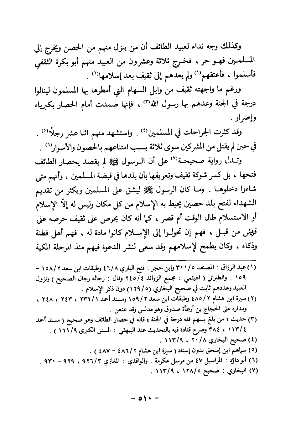 (¬1) عبد الرزاق: المصنف 5/ 301 وابن حجر: فتح الباري 8/ 46 وطبقات ابن سعد 2/ 158 - 159. والطبراني (الهيثمي: مجمع الزوائد 4/ 245 وقال: رجاله رجال الصحيح) ونزول العبيد وعددهم ثابت في صحيح البخاري (5/ 129) دون ذكر الإسلام.