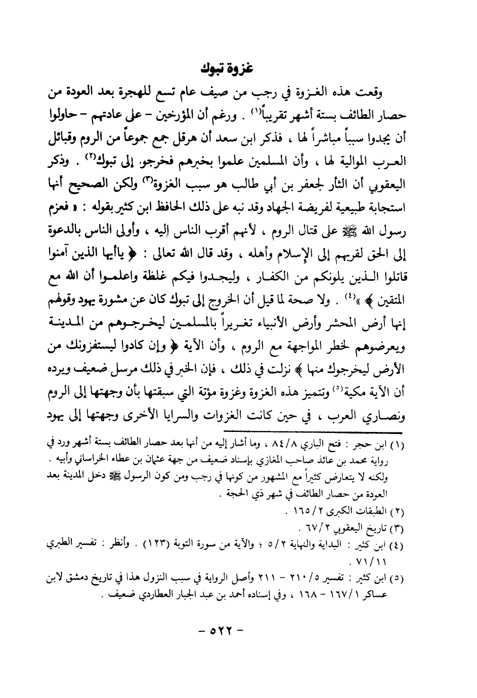 (¬1) ابن حجر: فتح الباري 8/ 84، وما أشار إليه من أنها بعد حصار الطائف بستة أشهر ورد في رواية محمد بن عائذ صاحب المغازي بإسناد ضعيف من جهة عثمان بن عطاء الخراساني وأبيه. ولكنه لا يتعارض كثيراً مع المشهور من كونها في رجب ومن كون الرسول صلى الله عليه وسلم دخل المدينة بعد العودة من حصار الطائف في شهر ذي الحجة.