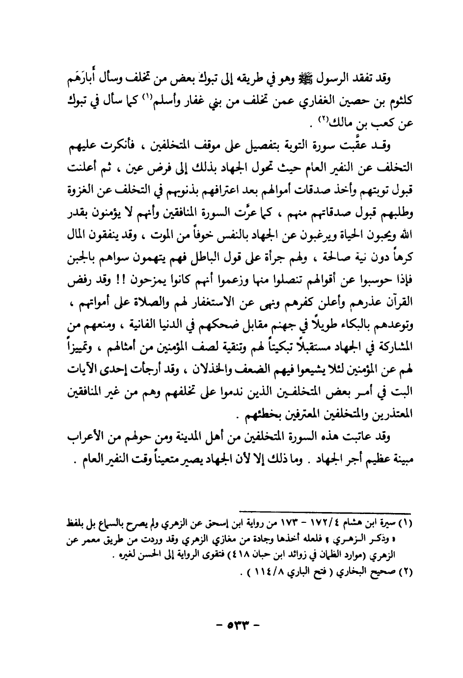 (¬1) سيرة ابن هشام 4/ 172 - 173 من رواية ابن إسحق عن الزهري ولم يصرح بالسماع بل بلفظ "وذكر الزهري" فلعله أخذها وجادة من مغازي الزهري وقد وردت من طريق معمر عن الزهري (موارد الظمآن في زوائد ابن حبان 418) فتقوى الرواية إلى الحسن لغيره.