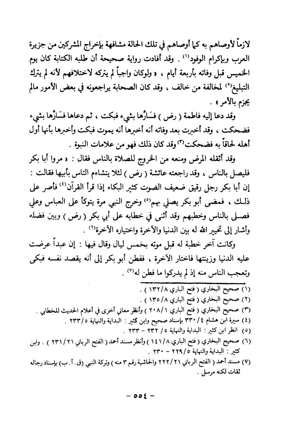 لازماً لأوصاهم به كما أوصاهم في تلك الحالة مشافهة بإخراج المشركين من جزيرة العرب وبإكرام الوفود (¬1). وقد أفادت رواية صحيحة أن طلبه الكتابة كان يوم الخميس قبل وفاته بأربعة أيام، "ولو كان واجباً لم يتركه لاختلافهم لأنه لم يترك التبليغ (¬2) لمخالفة من خالف، وقد كان الصحابة يراجعونه في بعض الأمور ما لم يجزم بالأمر".