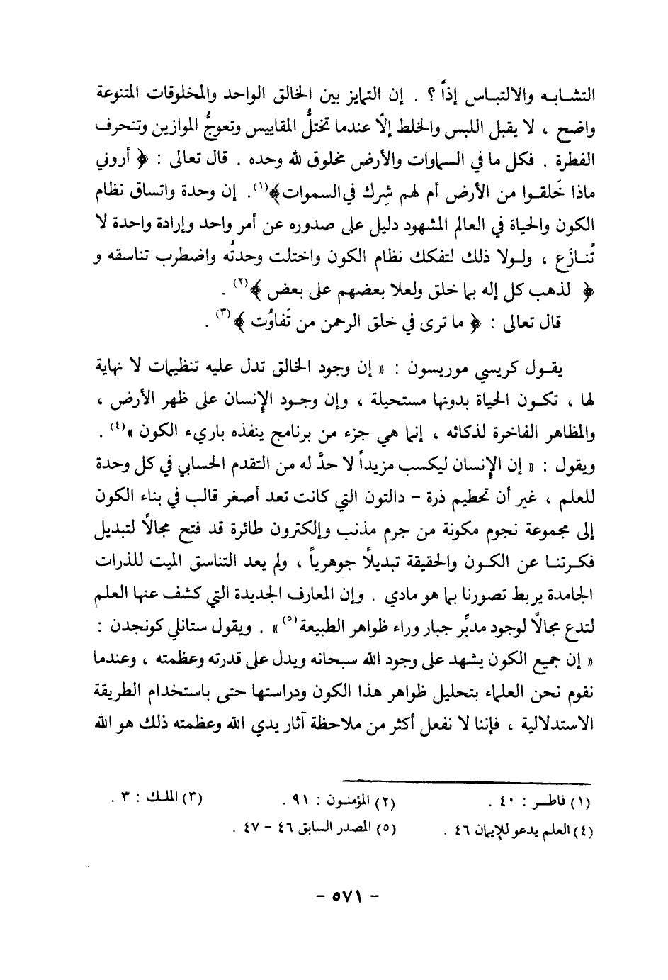 التشابه والالتباس إذاً؟. إن التمايز بين الخالق الواحد والمخلوقات المتنوعة واضح، لا يقبل اللبس والخلط إلا عندما تختل المقاييس وتعوج الموازين وتنحرف الفطرة. فكل ما في السماوات والأرض مخلوق لله وحده. قال تعالى: {أَرُونِي مَاذَا خَلَقُوا مِنَ الْأَرْضِ أَمْ لَهُمْ شِرْكٌ فِي السَّمَاوَاتِ} (¬1). إن وحدة واتساق نظام الكون والحياة في العالم المشهود دليل على صدوره عن أمر واحد وإرادة واحدة لا تنازع، ولولا ذلك لتفكك نظام الكون واختلت وحدته واضطرب تناسقه و {لَذَهَبَ كُلُّ إِلَهٍ بِمَا خَلَقَ وَلَعَلَا بَعْضُهُمْ عَلَى بَعْضٍ} (¬2).