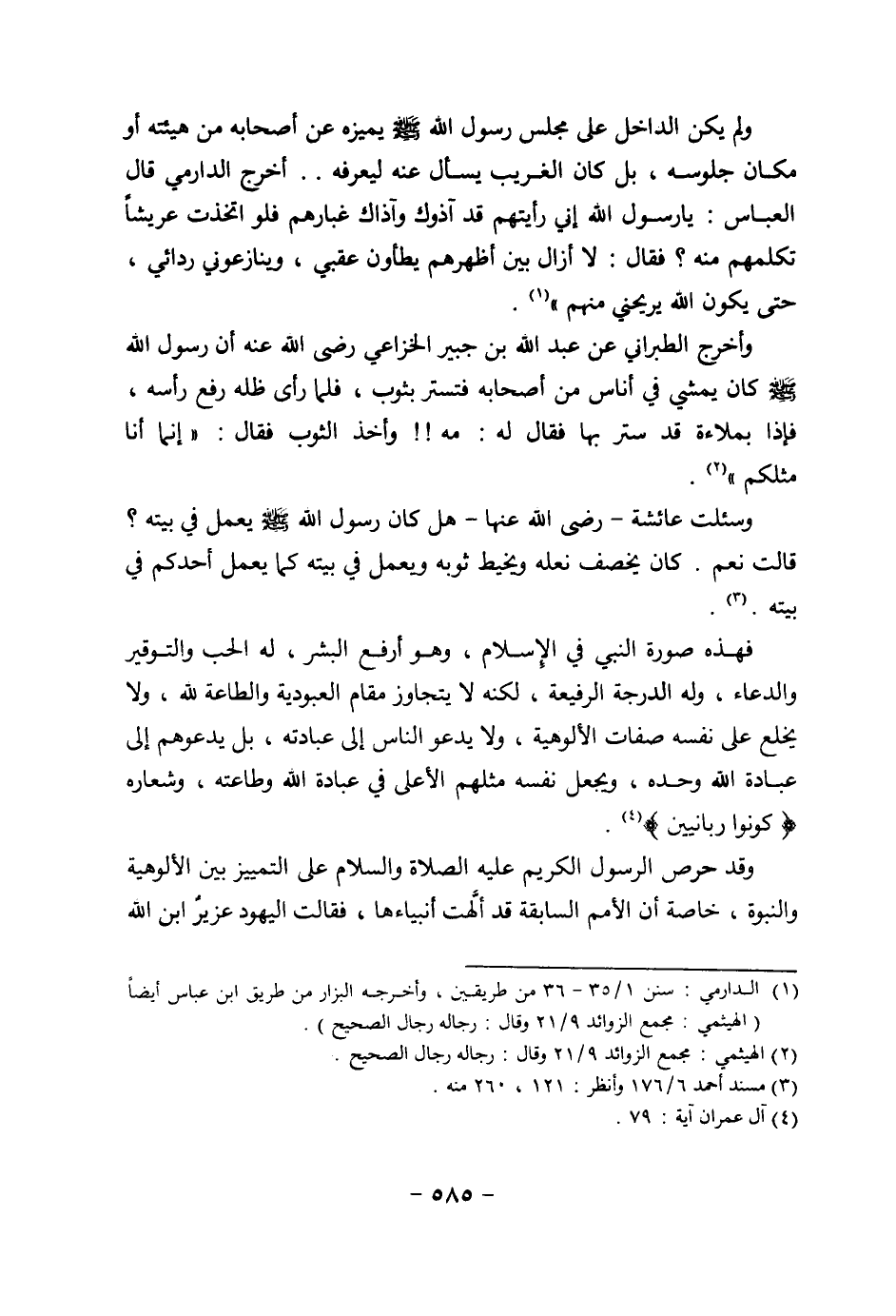 فهذه صورة النبي في الإسلام، وهو أرفع البشر، له الحب والتوقير والدعاء، وله الدرجة الرفيعة، لكنه لا يتجاوز مقام العبودية والطاعة لله، ولا يخلع على نفسه صفات الألوهية، ولا يدعو الناس إلى عبادته، بل يدعوهم إلى عبادة الله وحده، ويجعل نفسه مثلهم الأعلى في عبادة الله وطاعته، وشعاره ({كُونُوا رَبَّانِيِّينَ} (¬4).