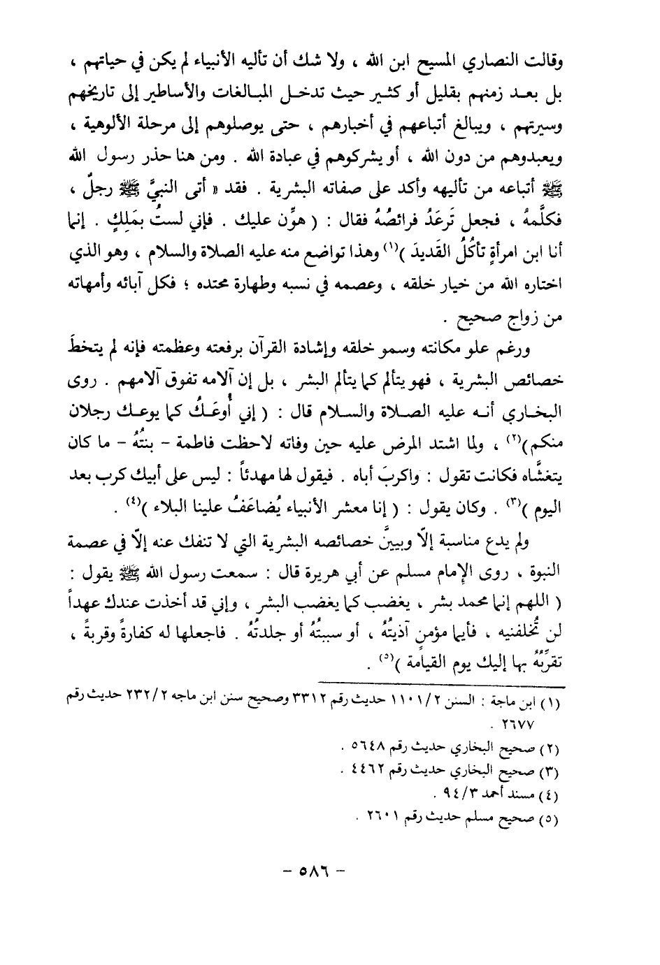 وقالت النصارى المسيح ابن الله، ولا شك أن تأليه الأنبياء لم يكن في حياتهم، بل بعد زمنهم بقليل أو كثير حيث تدخل المبالغات والأساطير إلى تاريخهم وسيرتهم، ويبالغ أتباعهم في أخبارهم، حتى يوصلوهم إلى مرحلة الألوهية، ويعبدوهم من دون الله، أو يشركوهم في عبادة الله. ومن هنا حذر رسول الله صلى الله عليه وسلم من تأليهه وأكد على صفاته البشرية. فقد "أتى النبي صلى الله عليه وسلم رجل، فكلمه، فجعل ترعد فرائصه فقال: (هوِّن عليك. فإني لست بملك. إنما أنا ابن امرأة تأكل القديد) (¬1) وهذا تواضع منه عليه الصلاة والسلام، وهو الذي اختاره الله من خيار خلقه، وعصمه في نسبه وطهارة محتده؛ فكل آبائه وأمهاته من زواج صحيح.