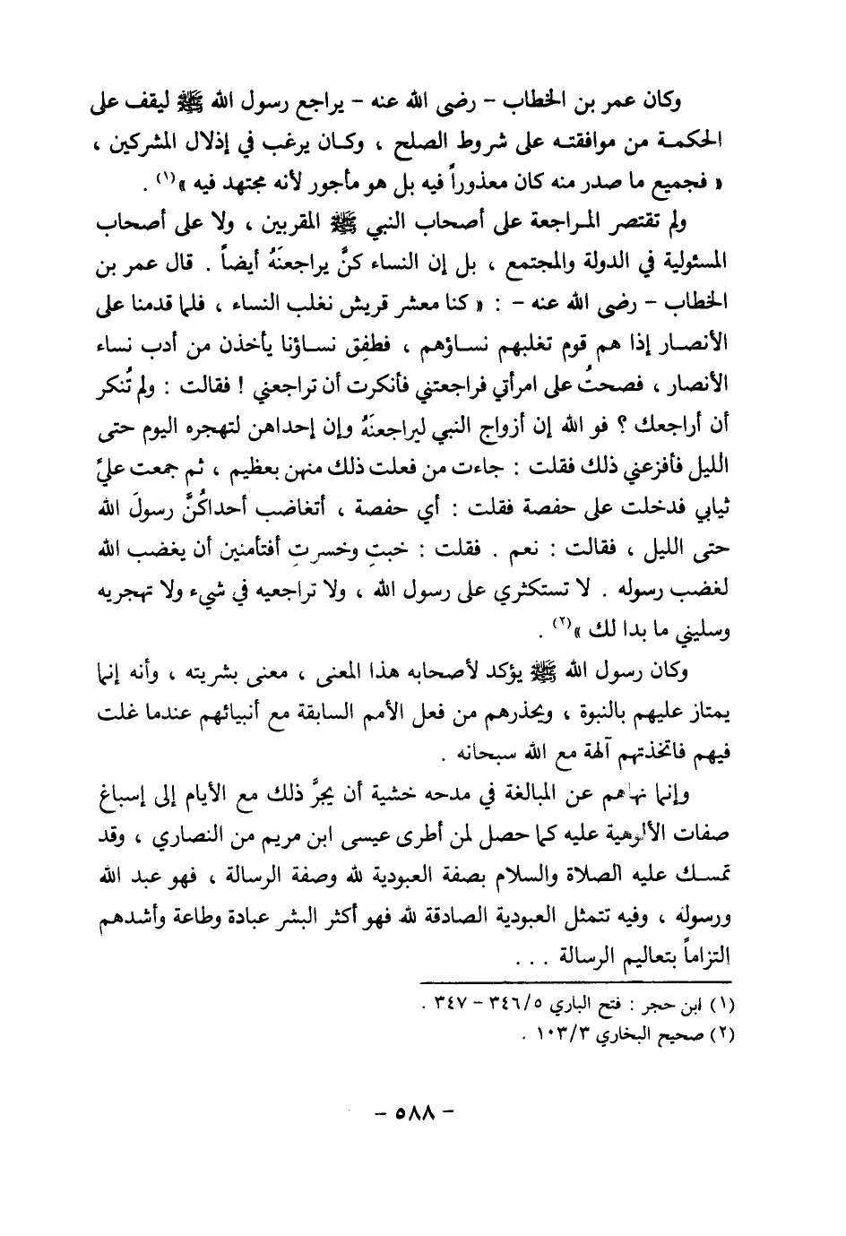 وكان عمر بن الخطاب - رضي الله عنه - يراجع رسول الله صلى الله عليه وسلم ليقف على الحكمة من موافقته على شروط الصلح، وكان يرغب في إذلال المشركين، "فجميع ما صدر منه كان معذورا فيه بل هو مأجور لأنه مجتهد فيه" (¬1).