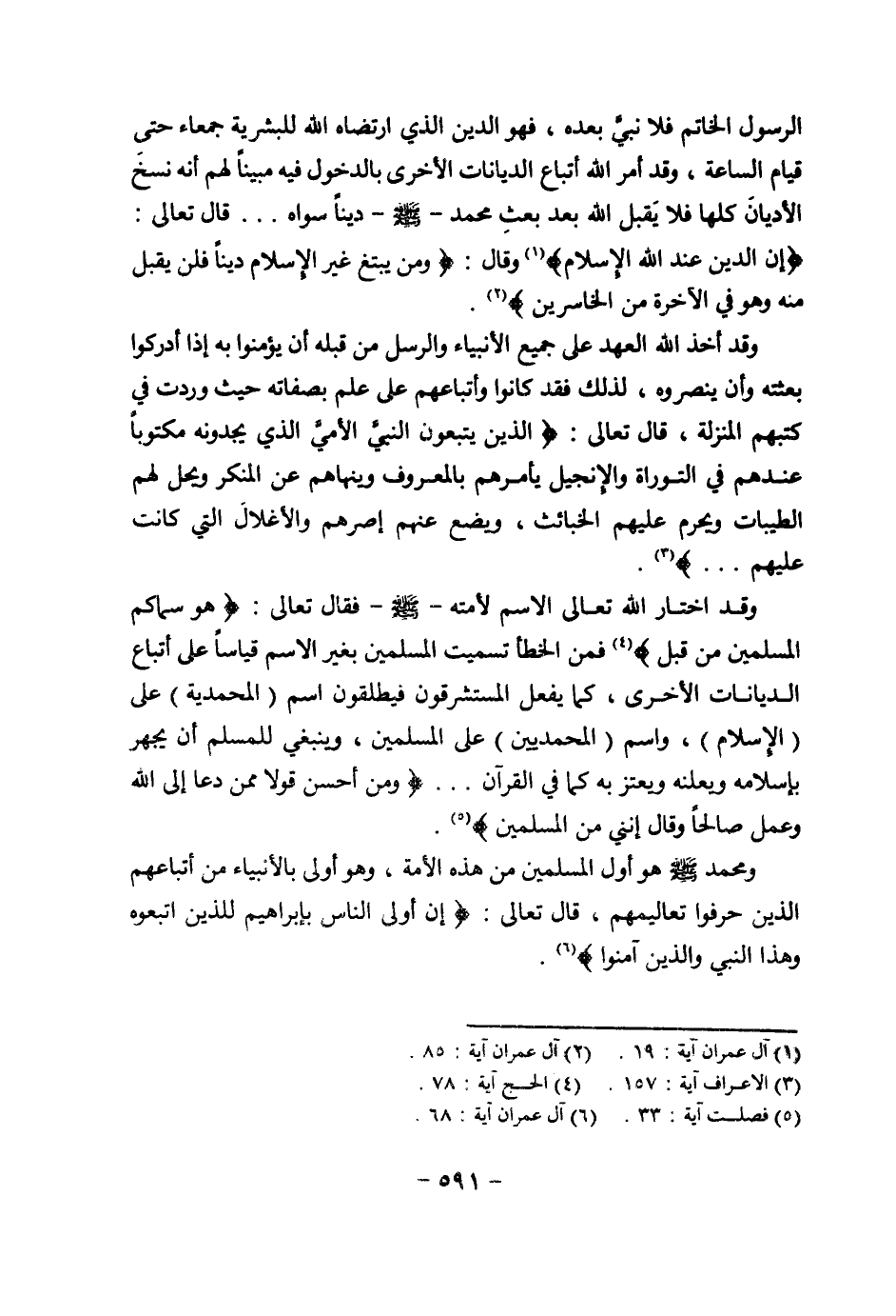 الرسول الخاتم فلا نبي بعده، فهو الدين الذي ارتضاه الله للبشرية جمعاء حتى قيام الساعة، وقد أمر الله أتباع الديانات الأخرى بالدخول فيه مبينا لهم أنه نسخ الأديان كلها فلا يقبل الله بعد بعث محمد -صلى الله عليه وسلم- دينا سواه ... قال تعالى: {إِنَّ الدِّينَ عِنْدَ اللَّهِ الْإِسْلَامُ} (¬1) وقال: {وَمَنْ يَبْتَغِ غَيْرَ الْإِسْلَامِ دِينًا فَلَنْ يُقْبَلَ مِنْهُ وَهُوَ فِي الْآخِرَةِ مِنَ الْخَاسِرِينَ} (¬2).