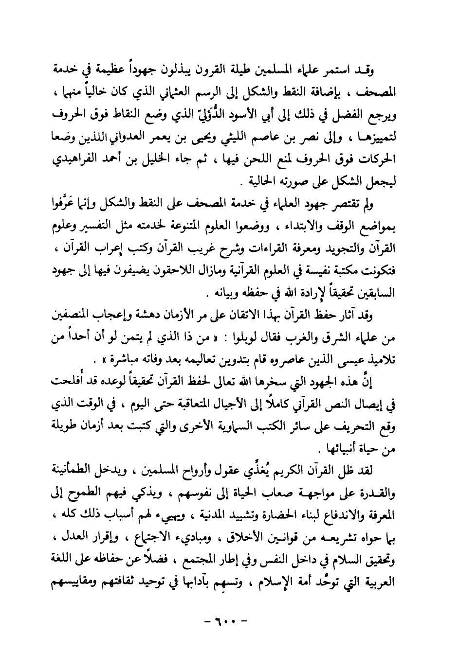 لقد ظل القرآن الكريم يغذي عقول وأرواح المسلمين، ويدخل الطمأنينة والقدرة على مواجهة صعاب الحياة إلى نفوسهم، ويذكي فيهم الطموح إلى المعرفة والاندفاع لبناء الحضارة وتشييد المدنية، ويهيئ لهم أسباب ذلك كله، بما حواه تشريعه من قوانين الأخلاق، ومبادئ الاجتماع، وإقرار العدل، وتحقيق السلام في داخل النفس وفي إطار المجتمع، فضلا عن حفاظه على اللغة العربية التي توحَّد أمة الإسلام، وتسهم بآدابها في توحيد ثقافتهم ومقاييسهم