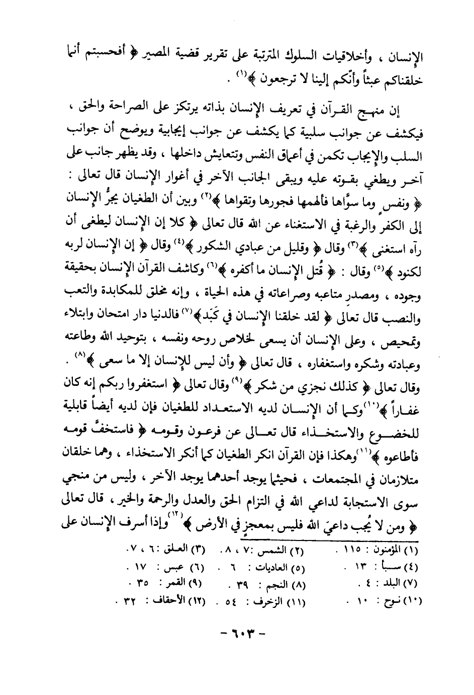 ويوضح أن جوانب السلب والإيجاب تكمن فى أعماق النفس وتتعايش داخلها ,وقد يظهر جانب على آخر ويطغى بقوته عليه ويبقى الجانب الآخر فى أغوار الإنسان قال تعالى {وَنَفْسٍ وَمَا سَوَّاهَا (7) فَأَلْهَمَهَا فُجُورَهَا وَتَقْوَاهَا} (¬2) وبين أن الطغيان يجر الإنسان إلى الكفر والرغبة فى الاستغناء عن الله قال تعالى {كَلَّا إِنَّ الْإِنْسَانَ لَيَطْغَى (6) أَنْ رَآهُ اسْتَغْنَى} (¬3) وقال {وَقَلِيلٌ مِنْ عِبَادِيَ الشَّكُورُ} (¬4) وقال {إِنَّ الْإِنْسَانَ لِرَبِّهِ لَكَنُودٌ} (¬5) وقال {قُتِلَ الْإِنْسَانُ مَا أَكْفَرَهُ} (¬6) وكاشف القرآن الإنسان بحقيقة وجوده ,ومصدر متاعبه وصراعاته فى هذه الحياة, وإنه مخلق للمكابدة والتعب والنصب قال تعالى {لَقَدْ خَلَقْنَا الْإِنْسَانَ فِي كَبَدٍ} (¬7) فالدنيا دار امتحان وابتلاء وتمحيص, وعلى الإنسان أن يسعى لخلاص روحه ونفسه, بتوحيد الله وطاعته وعبادته وشكره واستغفاره, قال تعالى: {وَأَنْ لَيْسَ لِلْإِنْسَانِ إِلَّا مَا سَعَى} (¬8) وقال تعالى {كَذَلِكَ نَجْزِي مَنْ شَكَرَ} (¬9) وقال تعالى {اسْتَغْفِرُوا رَبَّكُمْ إِنَّهُ كَانَ غَفَّارًا} (¬10) وكما أن الإنسان لديه استعدادا للطغيان فإن لديه أيضا قابلية للخضوع والاستخذاء قال تعالى عن قوم فرعون وقومه: {فَاسْتَخَفَّ قَوْمَهُ فَأَطَاعُوهُ} (¬11) وهكذا فإن القرآن انكر الطغيان كما انكر الاستخذاء ,وهما خلقان متلازمان فى المجتمعات, فحيثما يوجد أحدهما يوجد الآخر, وليس من منجى سوى الاستجابة لداعى الله فى التزام الحق والعدل والرحمة والخير, قال تعالى {وَمَنْ لَا يُجِبْ دَاعِيَ اللَّهِ فَلَيْسَ بِمُعْجِزٍ فِي الْأَرْضِ} (¬12) وإذا أسرف الإنسان على